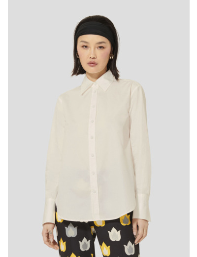 Cette chemise en popeline blanche possède une coupe droite, un col chemise et des manches longues boutonnées aux poignets. Elle se boutonne au-devant par de petits boutons écrus. Le logo de la maison est discrètement brodé sur le bas de la manche.