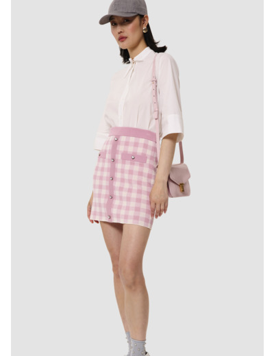 Cette chemise blanche en popeline possède un col mao qui se noue au devant par de fins liens ton sur ton et des manches 3/4 évasées. Il se boutonne entièrement au devant par de petits boutons ton sur ton. Au dos, une fente est présente au bas où l'on retrouve les petits liens à nouer.