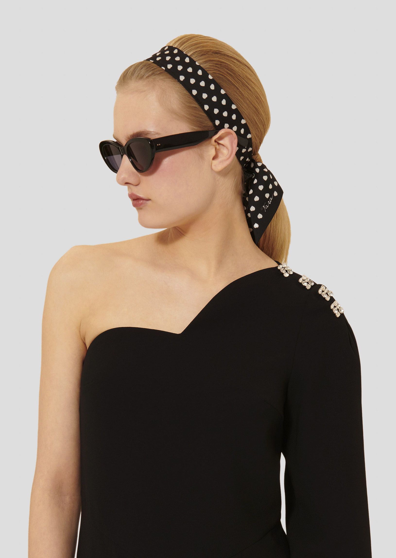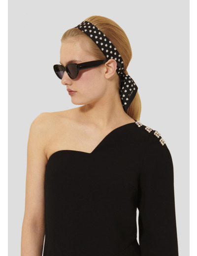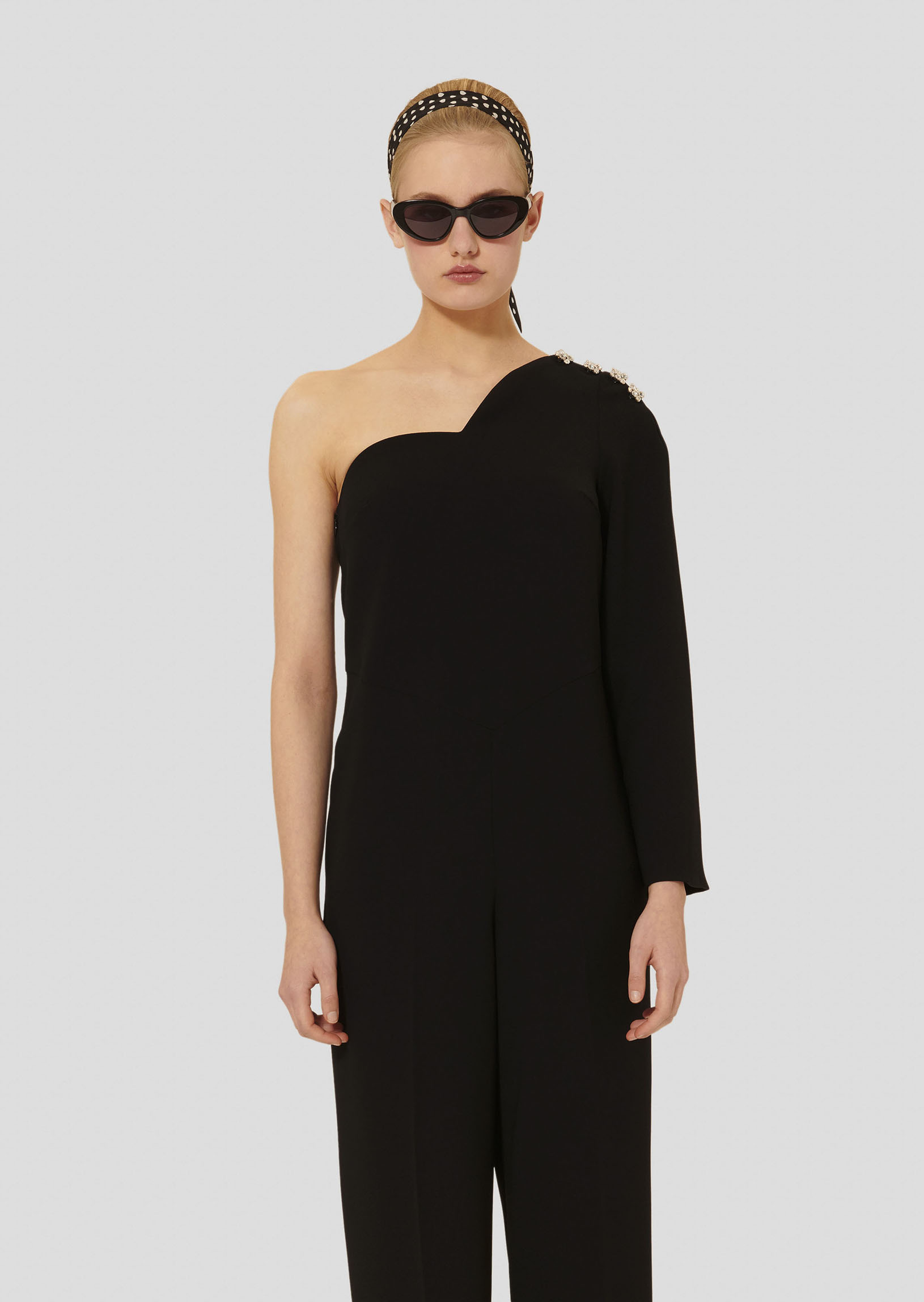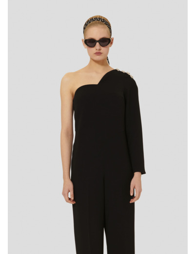 Cette combinaison en crêpe noire possède une jambe droite et fluide ainsi qu'une coupe asymétrique avec une seule manche longue. Sa touche Tara réside dans les délicats boutons bijoux situés sur son épaule gauche.