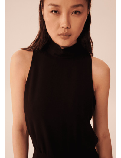 Cette combinaison noire en crêpe est sans manche. Elle possède un col montant qui se noue au dos par des liens ton sur ton. Elle est marquée à la taille par de jolies fronces. Sa jambe est droite et fluide pour un look féminin et élégant. Fermeture par un zip invisible au dos.
