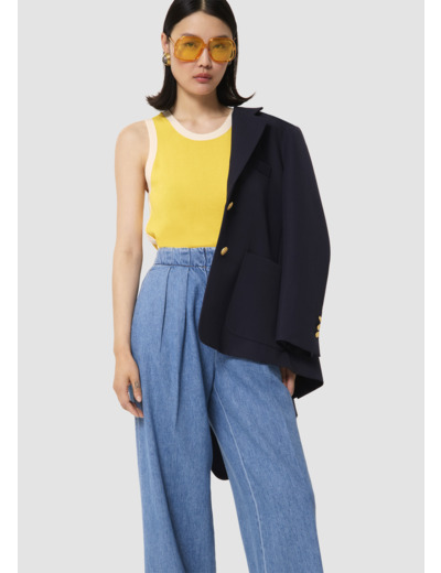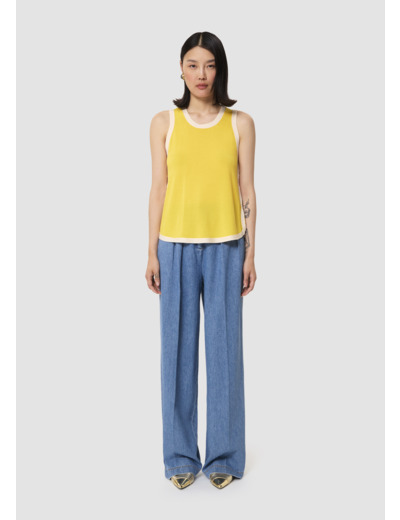 Ce pull fin jaune en coton est sans manches et possède une encolure ronde. Il est twisté par un bord-côte blanc accentuant l'encolure, le bas et les emmanchures et se rejoignant aux côtés en formant des vagues.