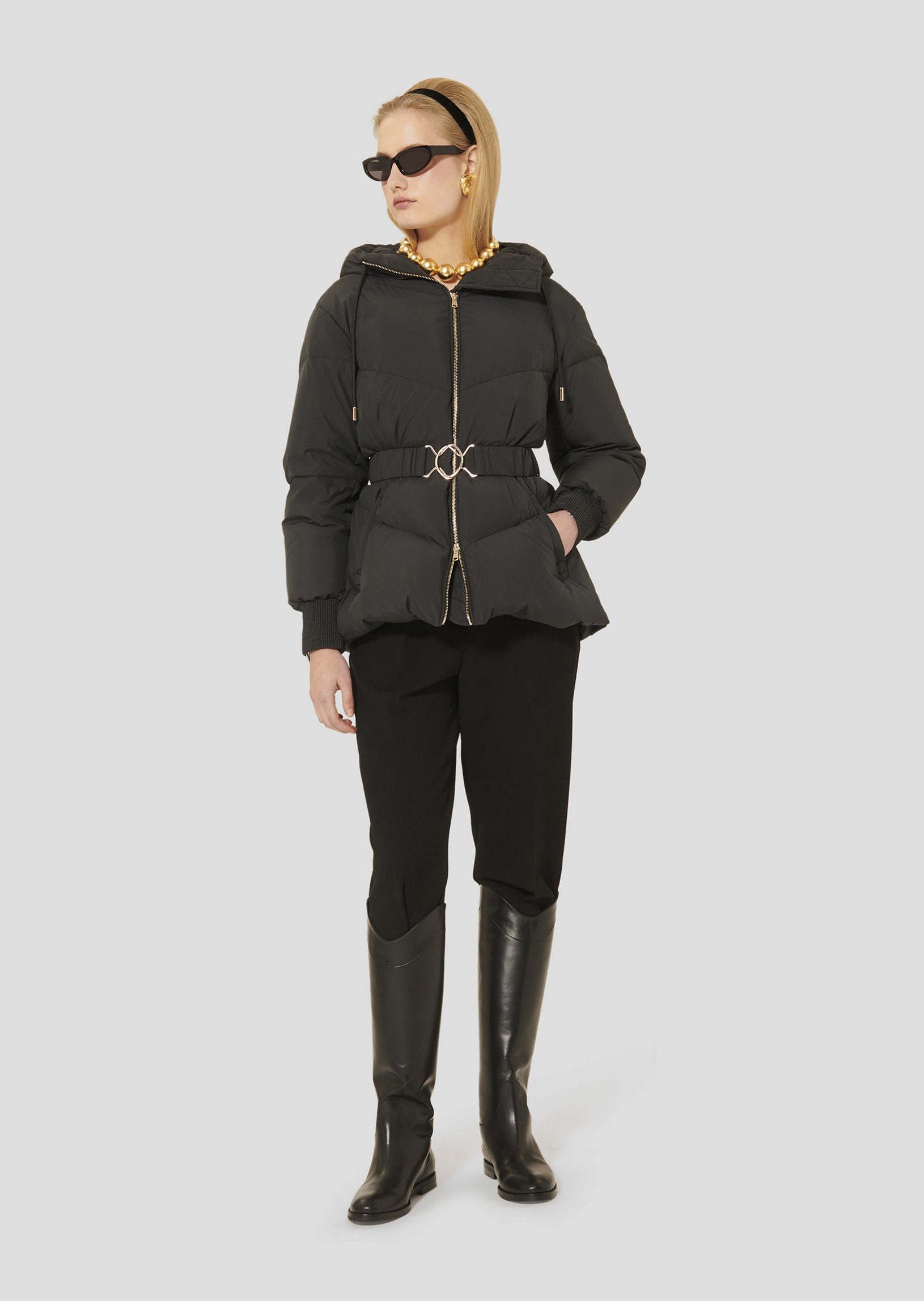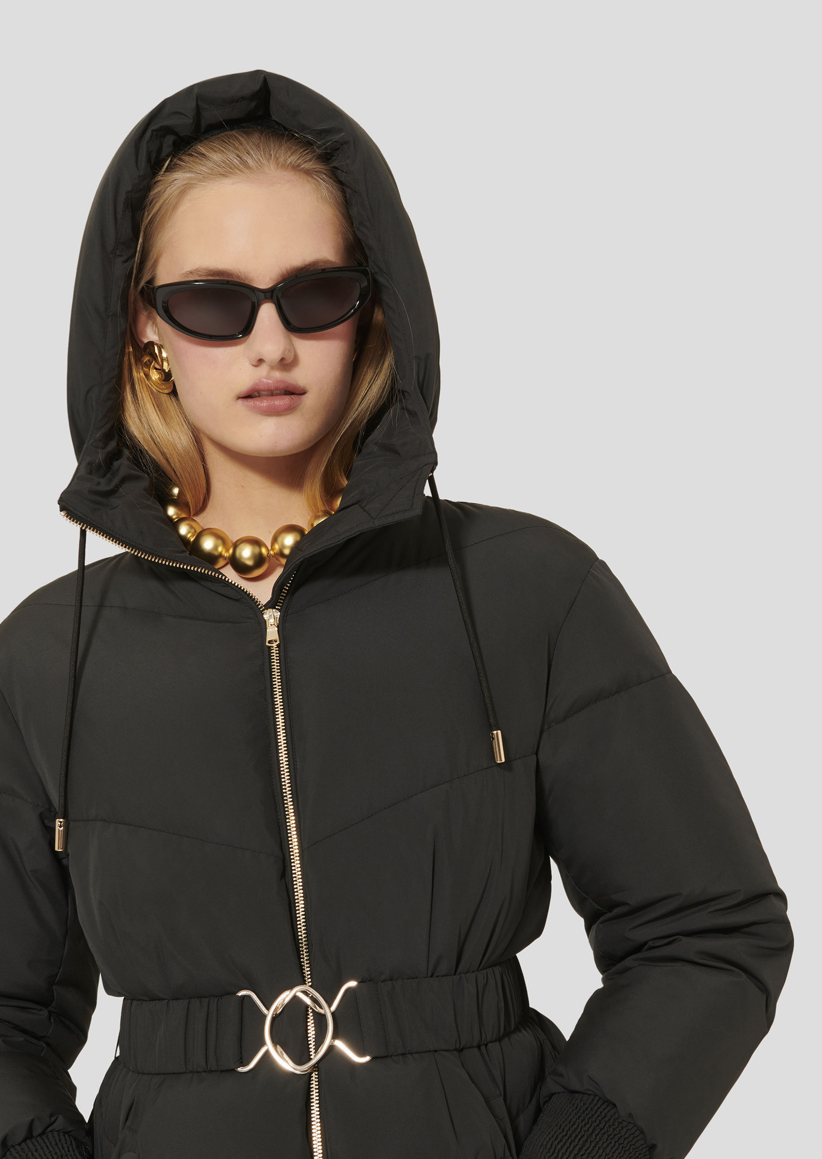 Cette doudoune noire matte possède des manches longues élastiquées aux poignets. Sa taille est marquée par une ceinture élastiquée ton sur ton se fermant par une boucle en métal doré. Elle se ferme au-devant par un long zip doré à double curseur. Elle possède une capuche pouvant se resserrer par des liens ton sur ton, ainsi que deux poches aux côtés. C'est la pièce idéale pour rester élégamment au chaud cette saison.