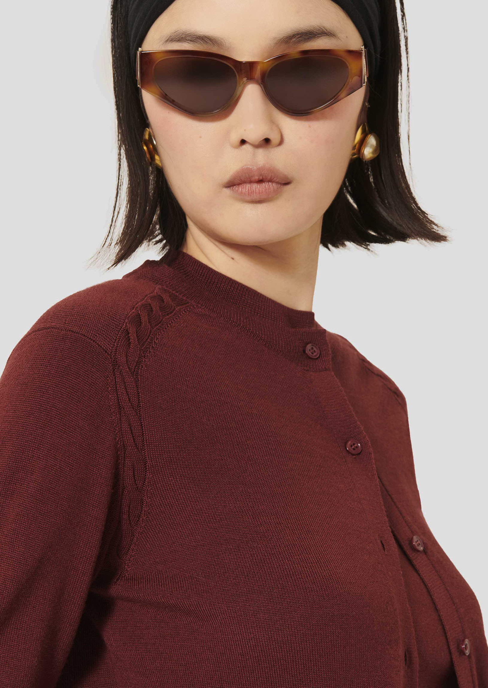 Ce gilet fin couleur bordeaux possède un col rond et des manches longues. De délicats détails de maille tressée ton sur ton décorent les épaules. Il se ferme au-devant par de petits boutons bordeaux. Il est entièrement confectionné en laine merinos extrafine pour vous tenir bien au chaud tout au long de la saison.