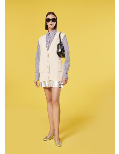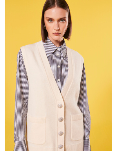 Ce gilet sans manches écru possède une coupe oversized avec une large encolure en V et deux grandes poches aux côtés. Il se boutonne par de jolis boutons bijoux, so Tara. Il est entièrement confectionné en laine merinos et alpaga pour vous apporter confort et douceur.