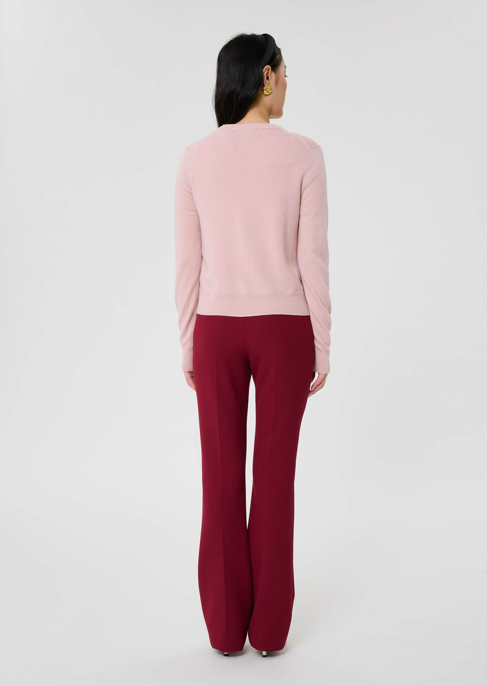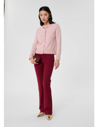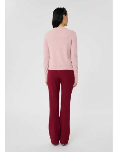 Ce gilet couleur vieux rose en cachemire possède des manches longues et un col rond. Des bords-cotes ton sur ton décorent le bas, les manches et l'encolure. Il se ferme au-devant par de petits boutons ton sur ton.
