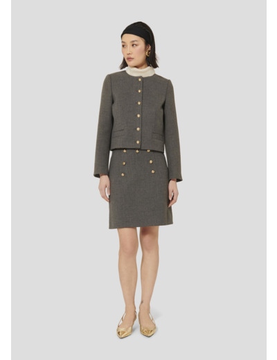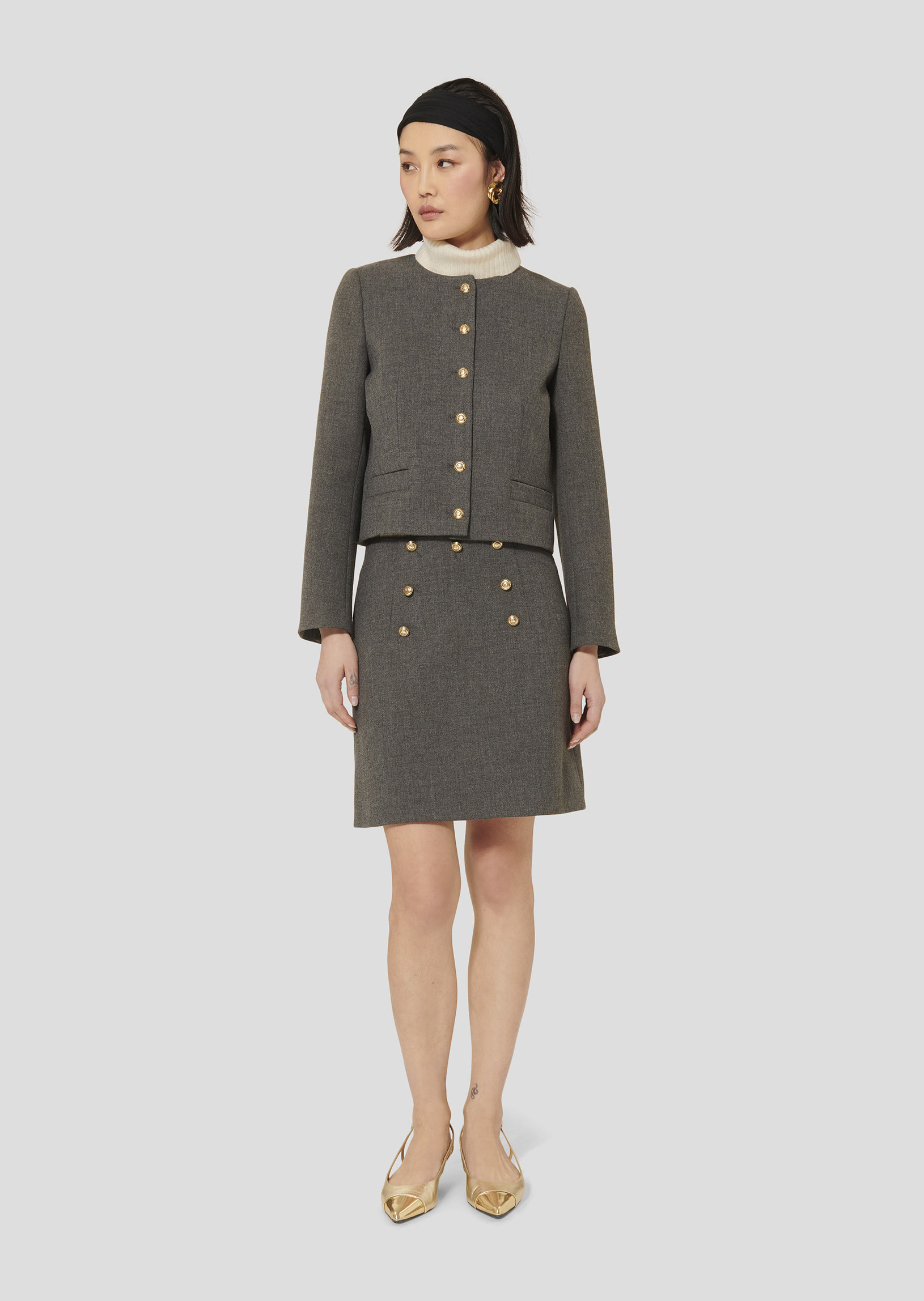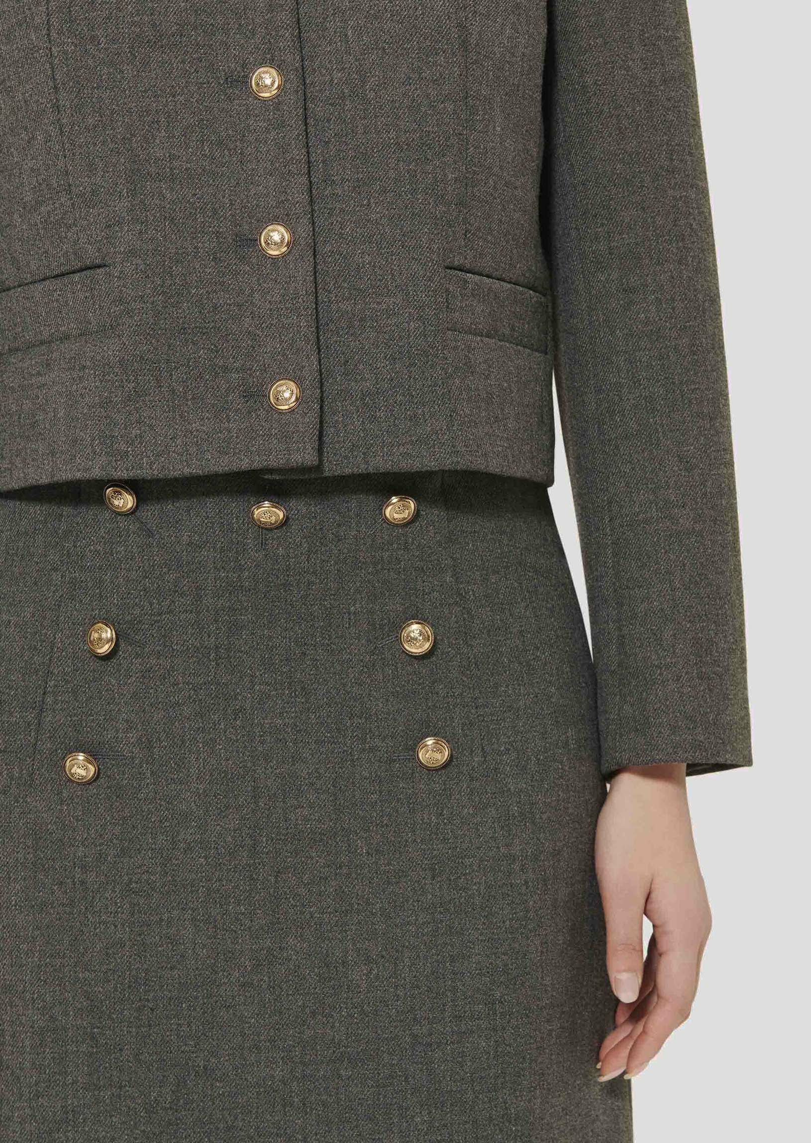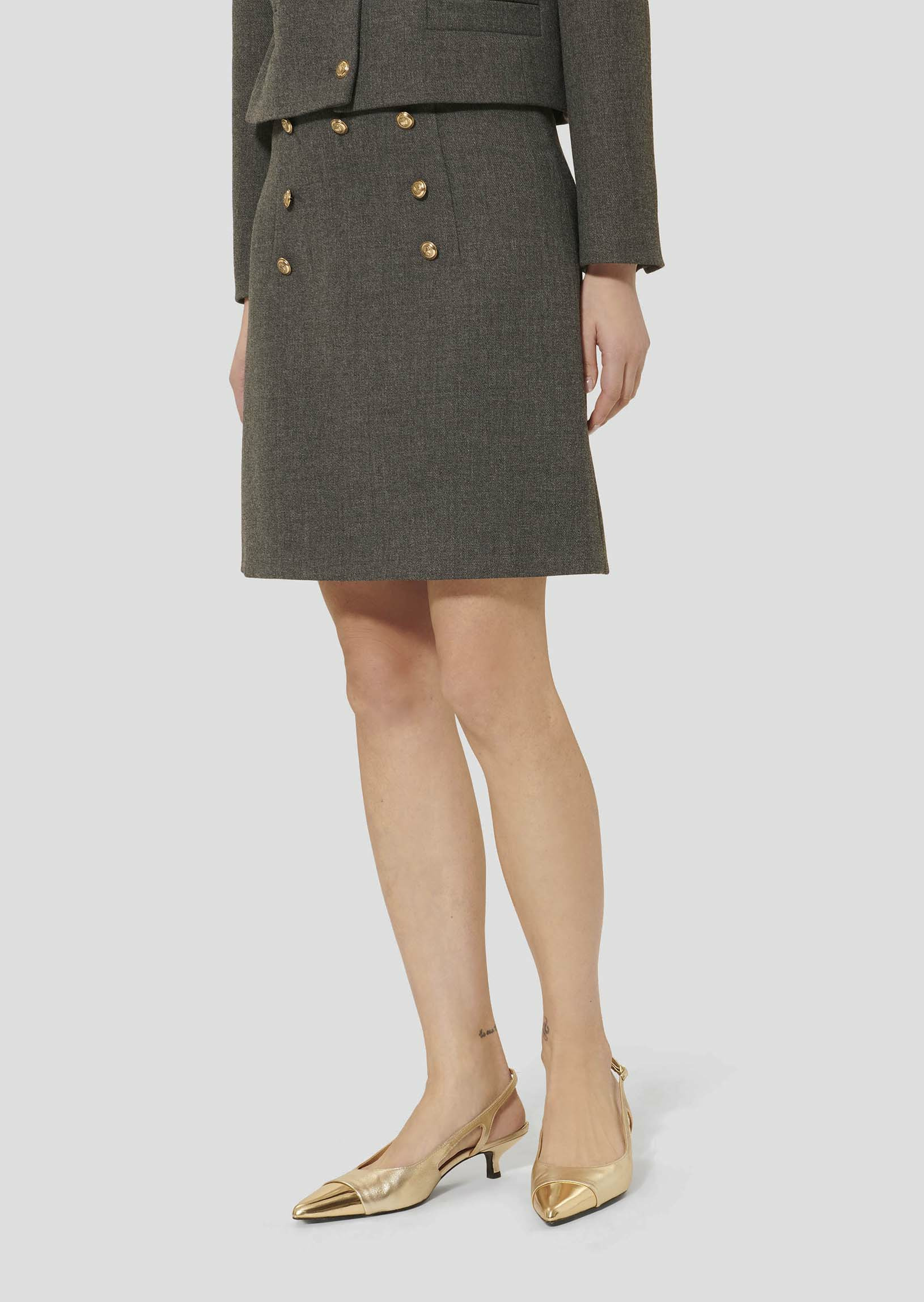 Cette jupe courte grise en toile possède une coupe courte et deux poches passepoilées au dos, et est décorée au-devant par des boutons dorés. Elle se ferme par un zip invisible au dos.