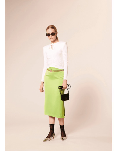 Cette jupe verte en satin fluide possède une longueur mi-mollet et une fermeture invisible à l'arrière. Ultra féminine, une jolie fente au côté laisse découvrir la jambe. On la porte avec le top Telly assorti pour un total look élégant à porter en toute occasion.