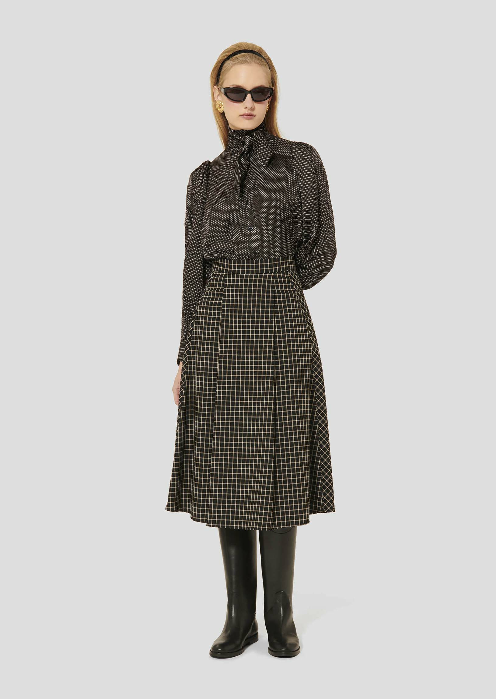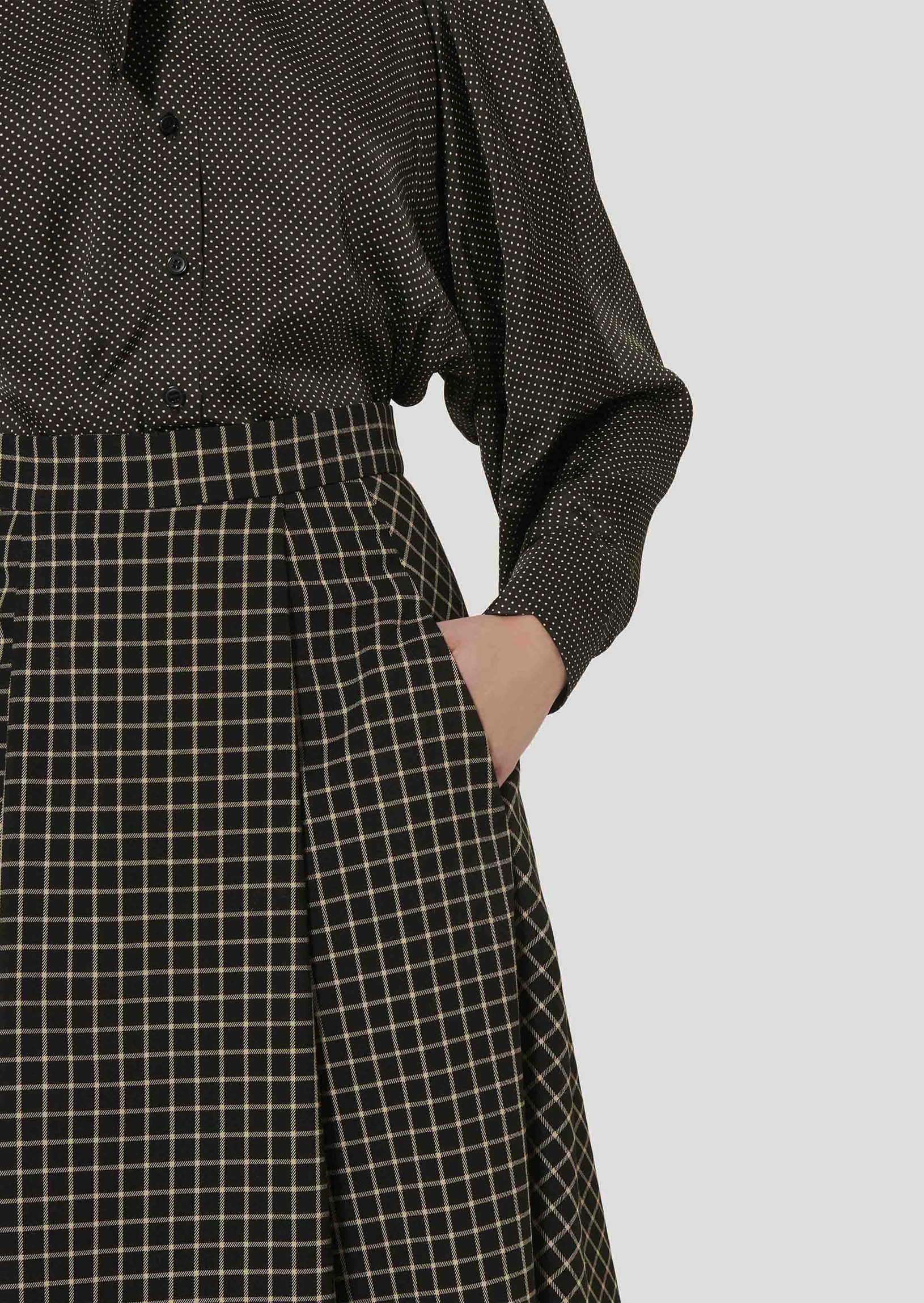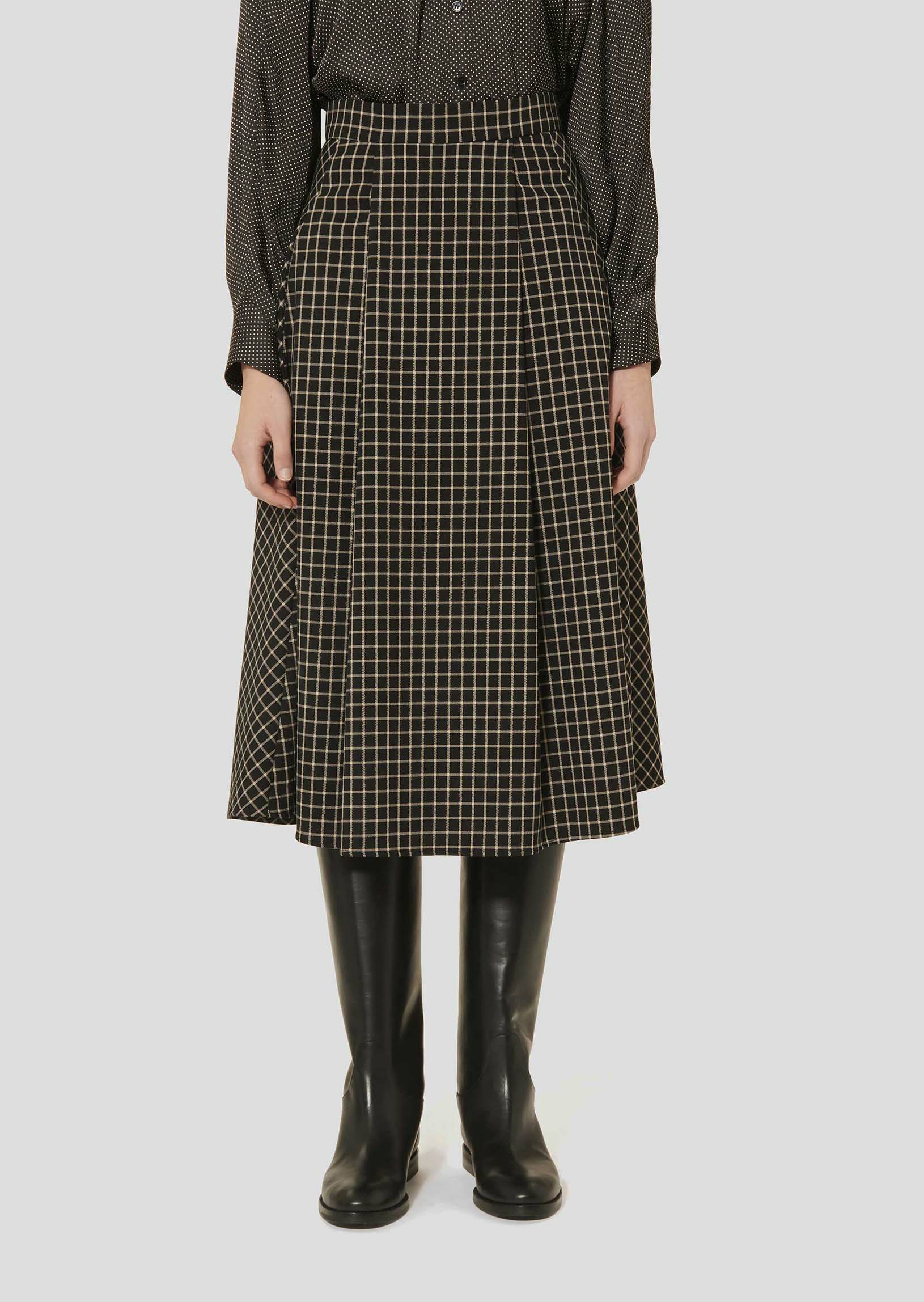 Cette longue jupe noire à carreaux possède une taille haute, une coupe évasée, des plis plats et deux poches aux côtés. Fermeture par zip invisible au dos. On la porte avec la veste Vannie assortie pour un total look élégant.