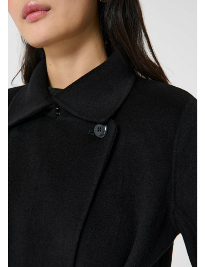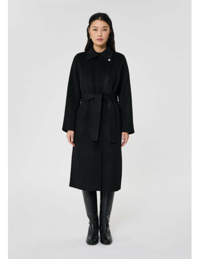 Ce manteau double face esprit trench noir possède un large col chemise, une fermeture assymétrique dissimulée ainsi qu'une ceinture ton sur ton à la taille pour souligner la silhouette. Ultra original et élégant, il possède également de larges poches aux côtés pour le confort.