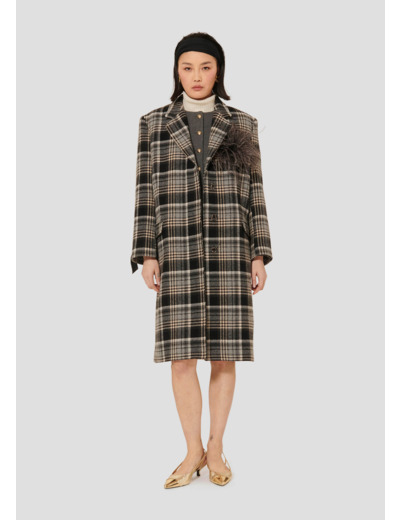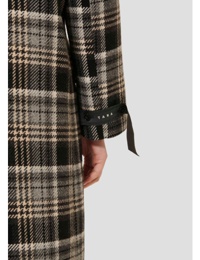 Ce long manteau en tartan gris possède un col à revers et deux grandes poches à rabats aux côtés. Il se ferme au-devant par de gros boutons noirs vernis. Petit twist, il est marqué de l'étiquette de la maison Tara Jarmon au poignet droit.