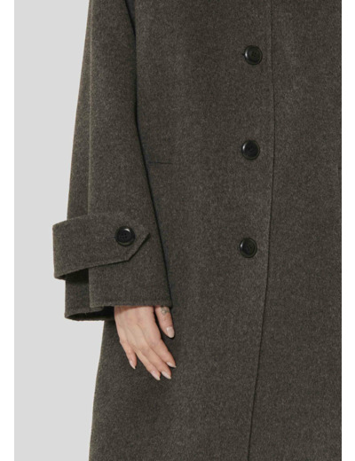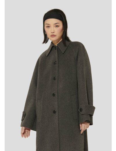 Ce long manteau double face gris possède un col chemise et des pattes de boutonnage aux poignets. Il se ferme au-devant par de gros boutons noirs vernis que l'on retrouve également au niveau des poignets.