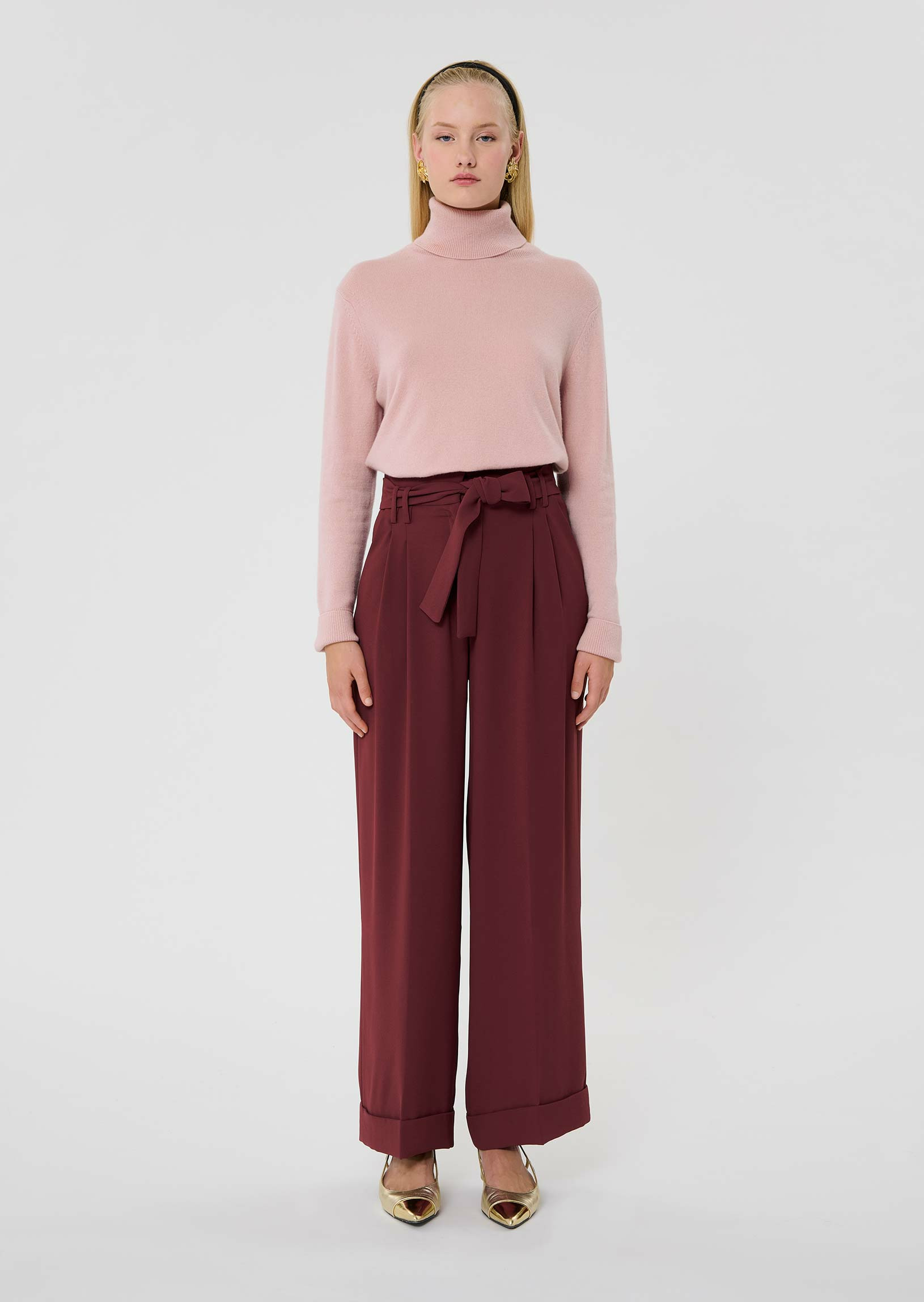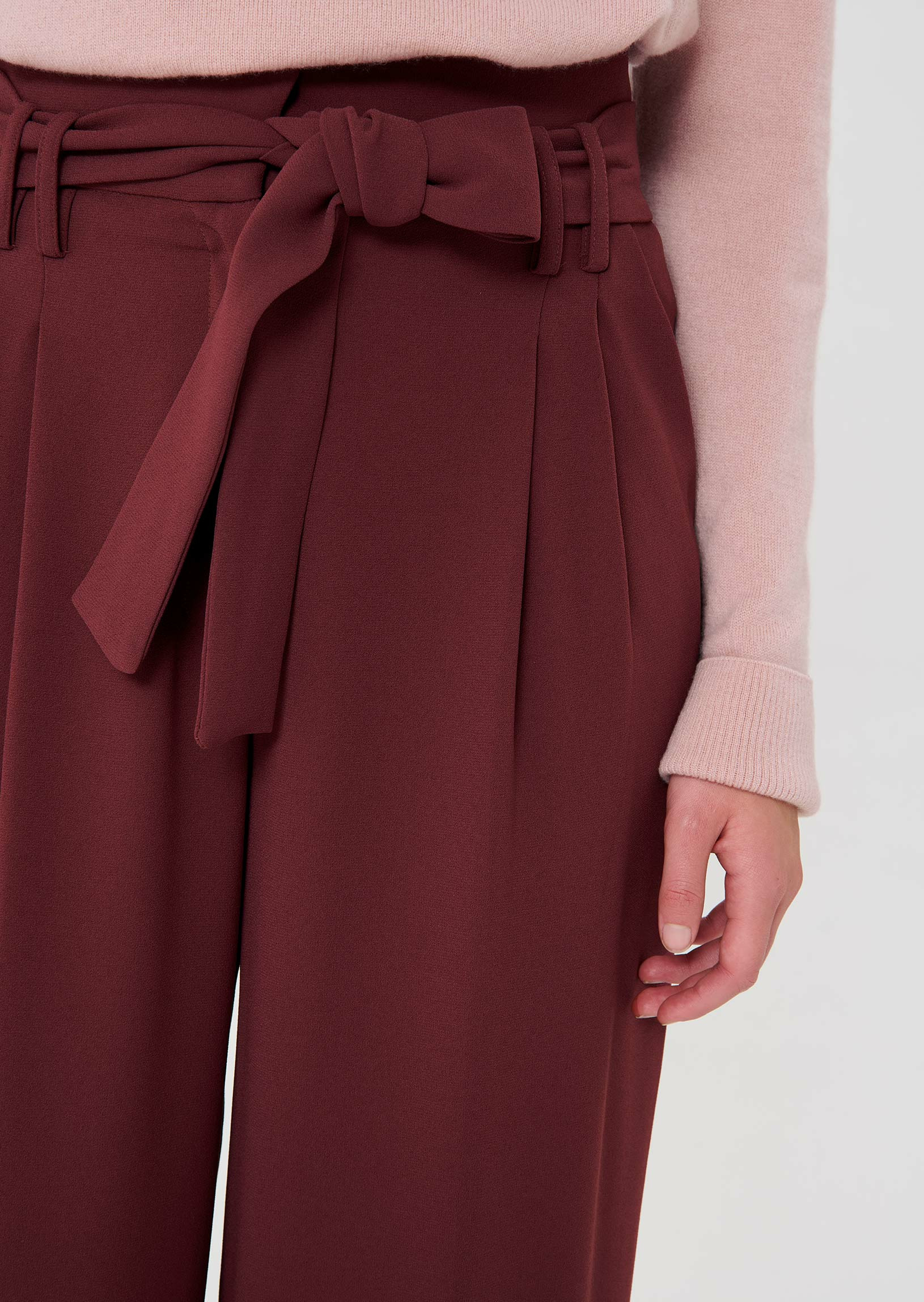 Notre iconique pantalon Pia est de retour en couleur bordeaux cette saison. En crêpe, il possède une jambe large et une taille haute marquée d'une ceinture ton sur ton avec de larges poches aux côtés et des revers au bas pour une allure toujours aussi élégante.