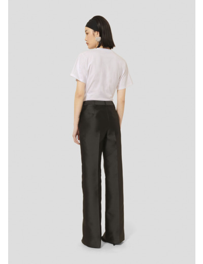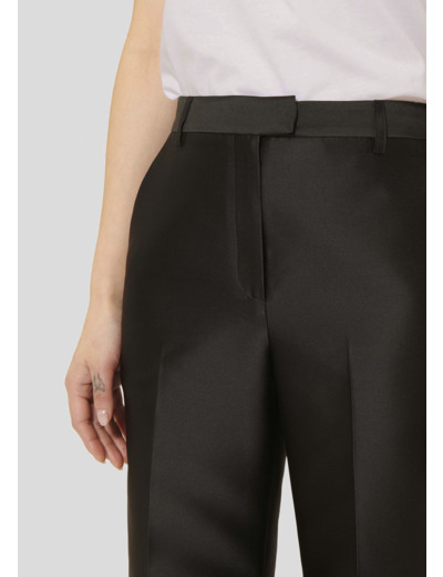 Ce pantalon noir en satin duchesse possède une jambe droite marquée d'un pli plat, 2 poches italiennes aux côtés et 1 poche passepoilée au dos. Il se ferme au-devant par un zip et une agrafe.