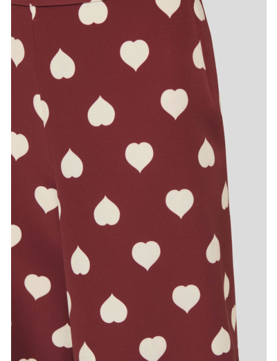 Ce pantalon bordeaux imprimé à cœurs blancs possède une jambe large et fluide et une taille mi-haute. Il se ferme par un zip invisible au dos. On le porte avec une pièce du même motif ou en mix and match pour un look original et féminin.
