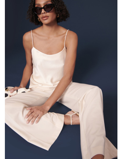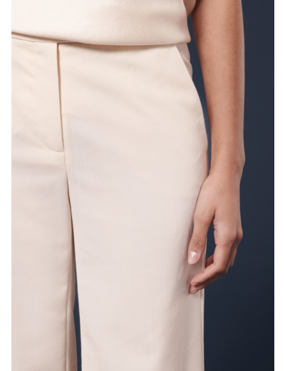 Ce pantalon écru en laine froide possède une coupe large et évasée et un pli plat. Elle a des poches italiennes aux côtés et des poches passepoilées au dos. Fermeture classique par zip, bouton et agrafe. On le porte avec la veste Viola assortie pour un total look chic et élégant.
