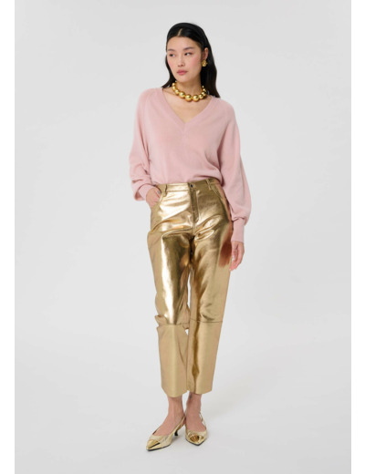 Ce pull couleur vieux rose en cachemire possède des manches longues et un col V. Des bords-cotes ton sur ton décorent le bas, les poignets et l'encolure.