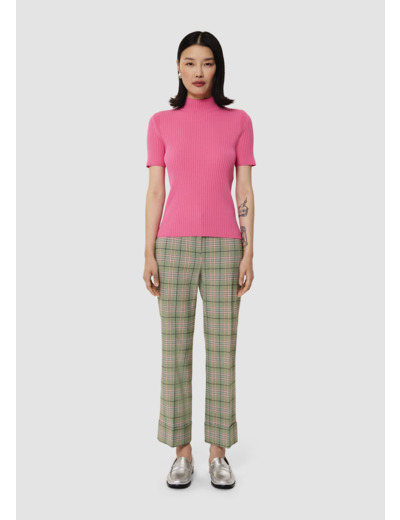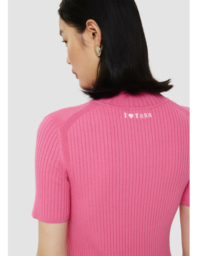 Ce sous-pull rose bonbon en maille côtelée est presque seconde peau. Il possède un petit col montant et des manches courtes. Son twist se trouve dans l'inscription "I love Tara" brodée en jacquard au niveau de la nuque.