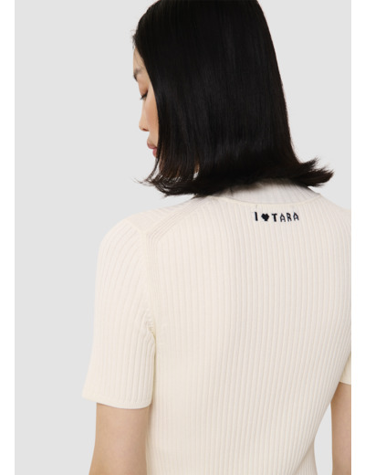 Ce sous-pull écru en maille côtelée est presque seconde peau. Il possède un petit col montant et des manches courtes. Son twist se trouve dans l'inscription "I love Tara" brodée en jacquard au niveau de la nuque.