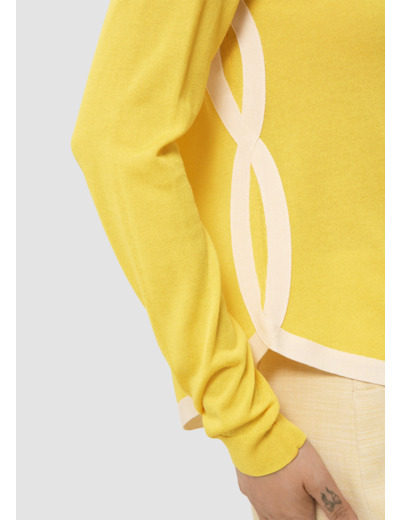 Ce pull jaune en coton fin possède une encolure ronde et des manches longues. Il est twisté par des bords-côtes blancs accentuant l'encolure, le bas et les emmanchures et se rejoignant aux côtés en formant des vagues.