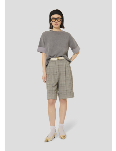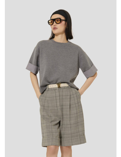 Ce pull gris en laine possède une coupe droite et large, un col rond et des manches courtes dont le bas est retroussé pour révéler une doublure en vichy noir. Entièrement confectionné en laine mérinos, il est votre allié cette saison pour vous apporter confort et douceur.