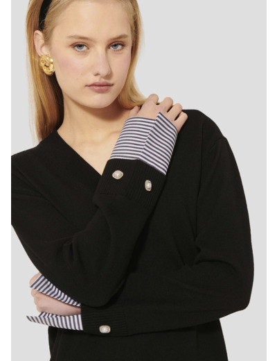 Ce pull noir possède un col V et des manches longues. La touche so Tara réside dans ses poignets trompe l'œil en popeline à rayures bleues décorés d'un bouton bijoux. Confectionné en laine mérinos, il est doux avec un toucher cachemire ultra confortable.