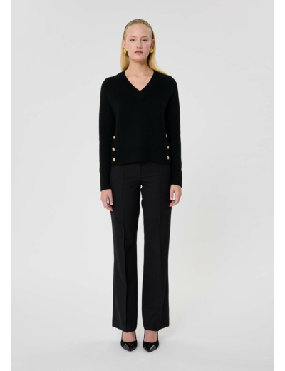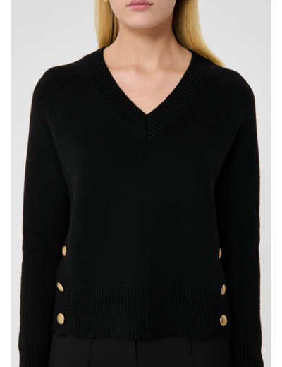 Ce pull noir à grosse maille en laine possède des manches longues aux poignets contrastants et une encolure en V à bord côte. Sa coupe est large. Les fentes aux côtés sont boutonnées par de gros boutons cuivrés en métal vieilli.