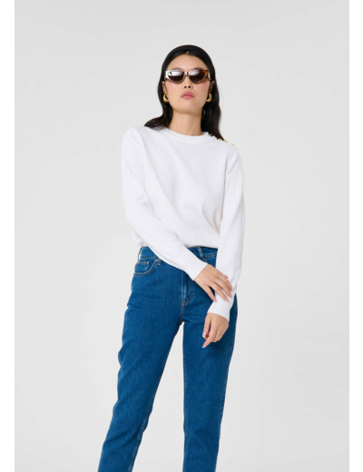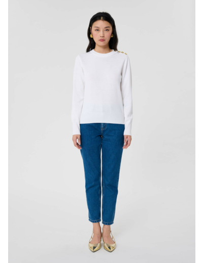 Ce pull écru possède des manches longues et un col rond. La touche so Tara est apportée par les boutons dorés ornés du monogramme de la maison qui décorent son épaule gauche. Il est confectionné en laine douce qui lui confère un toucher cachemire ultra confortable. Idéal pour la saison, sa couleur ultra lumineuse vous accompagnera au quotidien.