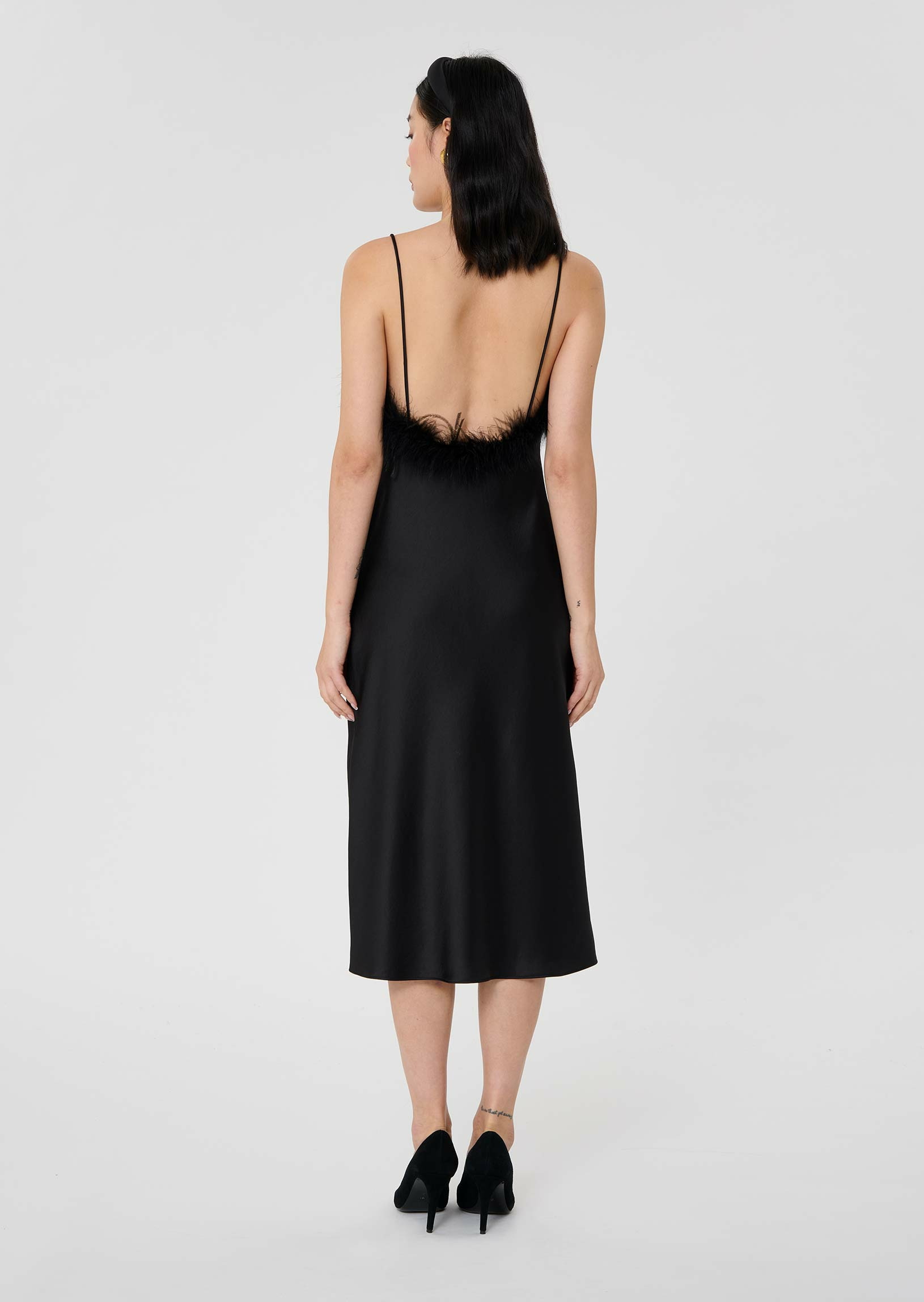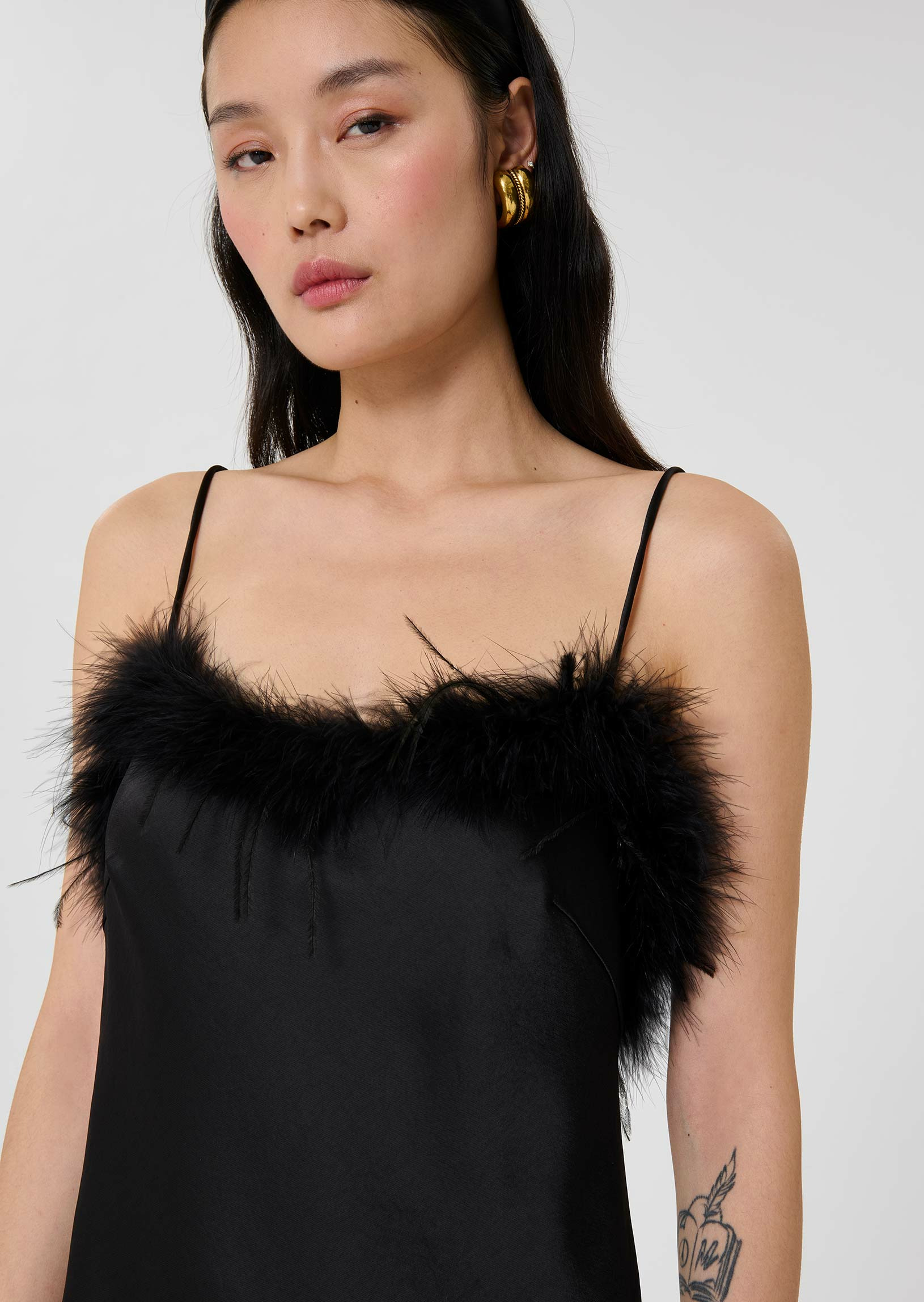 Cette longue robe en satin est sans manches et possède une coupe fluide cintrée à la taille, de fines bretelles noires et une encolure rectangle. Ultra féminine, elle a une fente au côté. Sa touche Tara réside dans l'empiècement de fausse fourrure noire qui décore l'encolure.