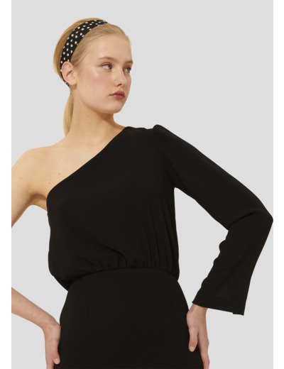 Cette longue robe noire en crêpe possède une forme asymétrique avec une manche longue et une coupe fluide cintrée à la taille. Elle possède une fente au côté pour une allure ultra féminine.