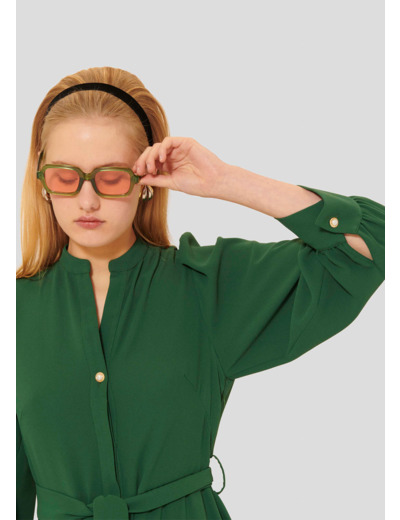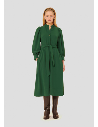 Cette longue robe verte en crêpe possède un col V et des manches longues boutonnées aux poignets. Elle est ajustable à la taille grâce à sa ceinture ton sur ton amovible. Elle se ferme au-devant par un bouton noir dissimulé ainsi qu'un joli bouton perle nacré que l'on retrouve également aux poignets.
