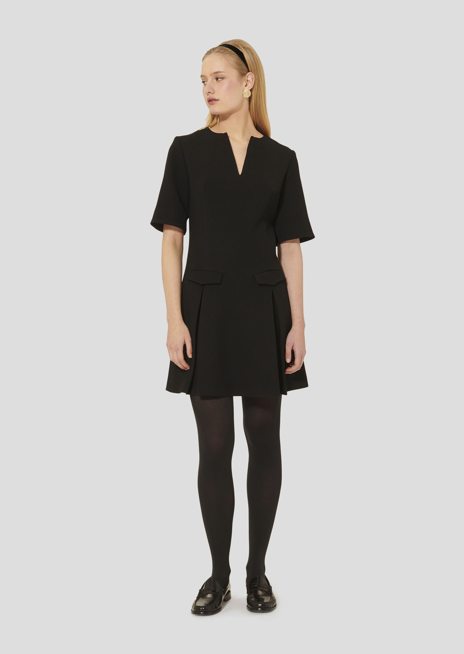 Cette robe courte noire en crêpe est légèrement évasée et possède une encolure ronde fendue ainsi que des manches courtes. Sa jupe est plissée et deux fausses poches à rabats se situent aux côtés. Elle se ferme par un zip invisible au dos.