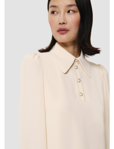 Cette robe écrue en crêpe possède une coupe droite, un col chemise et des manches longues ballons boutonnées aux poignets et froncées aux épaules. Elle se ferme au devant par de jolis boutons perles nacrés sous le col que l’on retrouve également aux poignets.