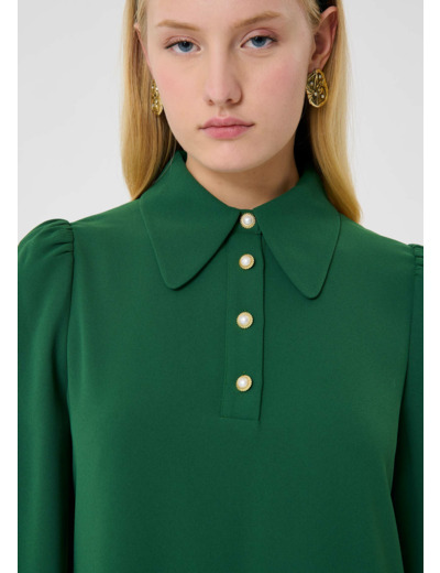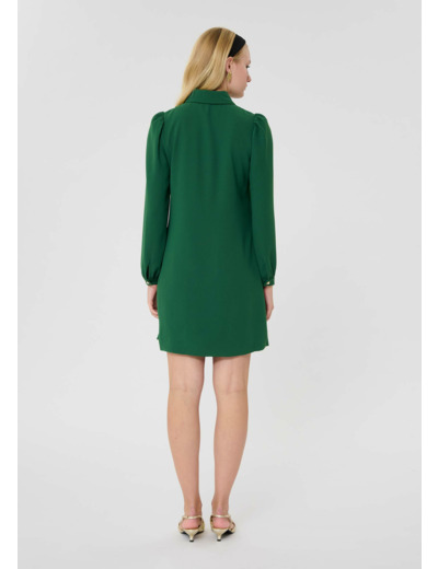 Cette robe verte en crêpe possède une coupe droite, un col chemise et des manches longues boutonnées aux poignets. Elle se ferme au-devant par de jolis boutons perles nacrés sous le col que l’on retrouve également aux poignets.