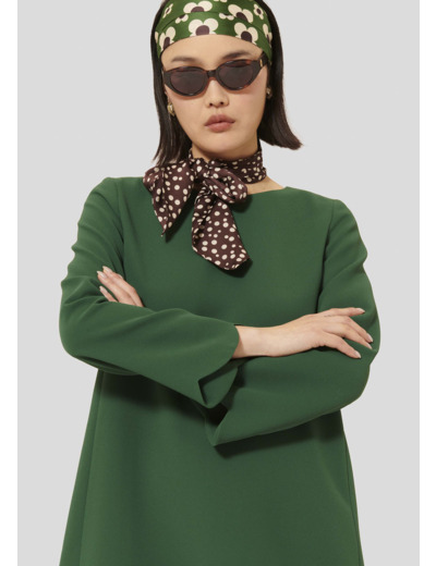 Cette robe courte verte en crêpe possède des manches longues évasée et une encolure ronde. Sa coupe trapèze lui donne un esprit preppy et sa finition festonnée apporte une touche féminine supplémentaire. Fermeture par zip invisible dans le dos.