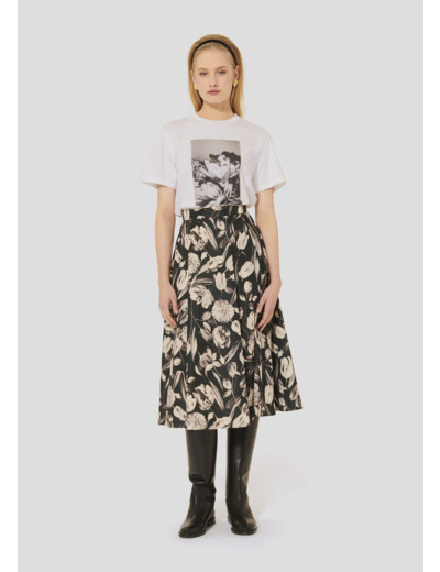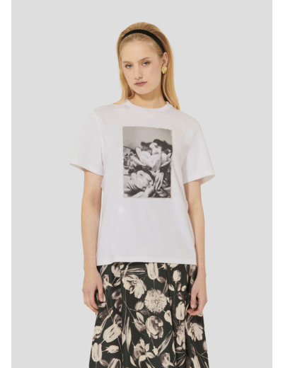Ce t-shirt blanc en coton possède des manches courtes, un col rond et une coupe droite classique. Son twist, so Tara, est apporté par une illustration fleurie en noir et blanc, encadrée de strass.