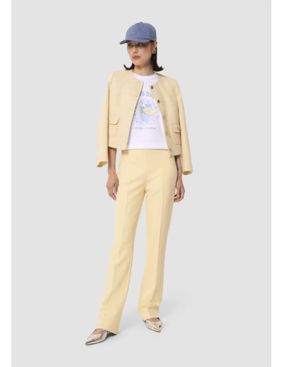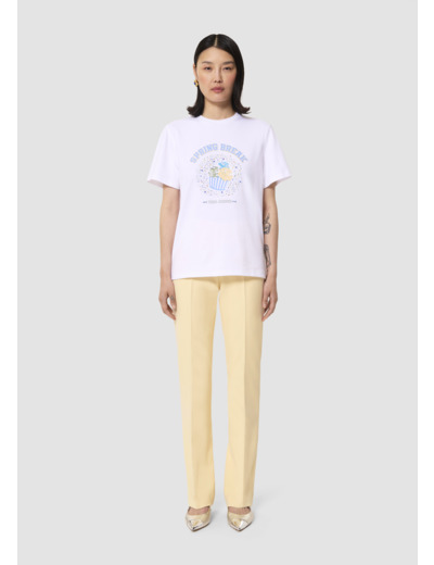 Ce t-shirt blanc en jersey possède les codes classiques du t-shirt : un col rond, des manches courtes et une coupe droite classique. Son twist, so Tara, est apporté par son motif spring break décoré de perles brodées signé “Tara Jarmon”.