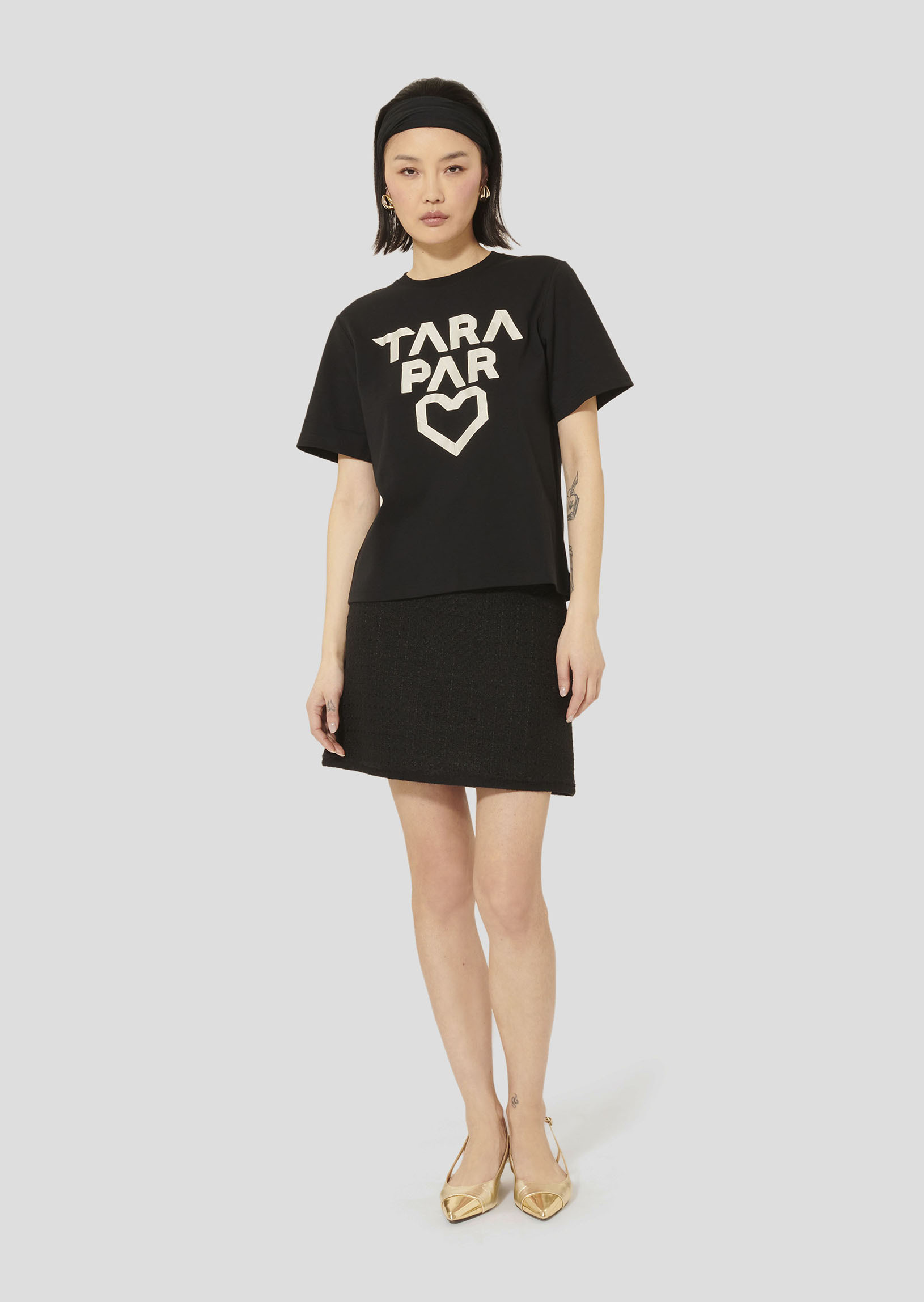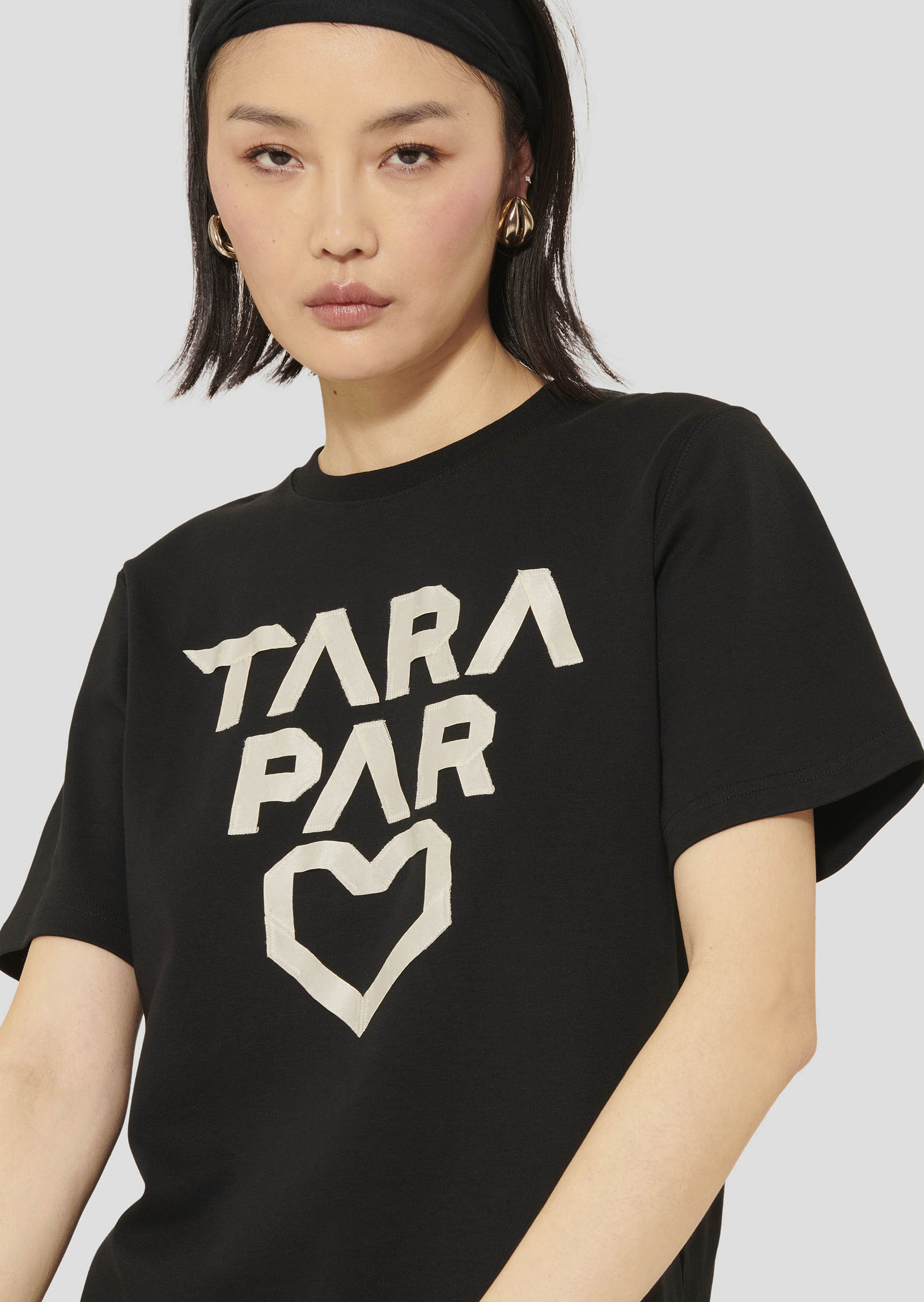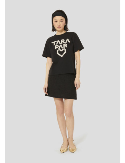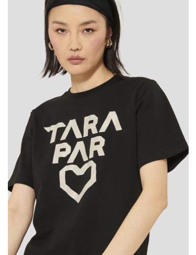 Ce t-shirt noir en coton possède des manches courtes, un col rond et une coupe droite classique. Son twist, so Tara, est apporté par l'inscription "Tara par cœur" en blanc.