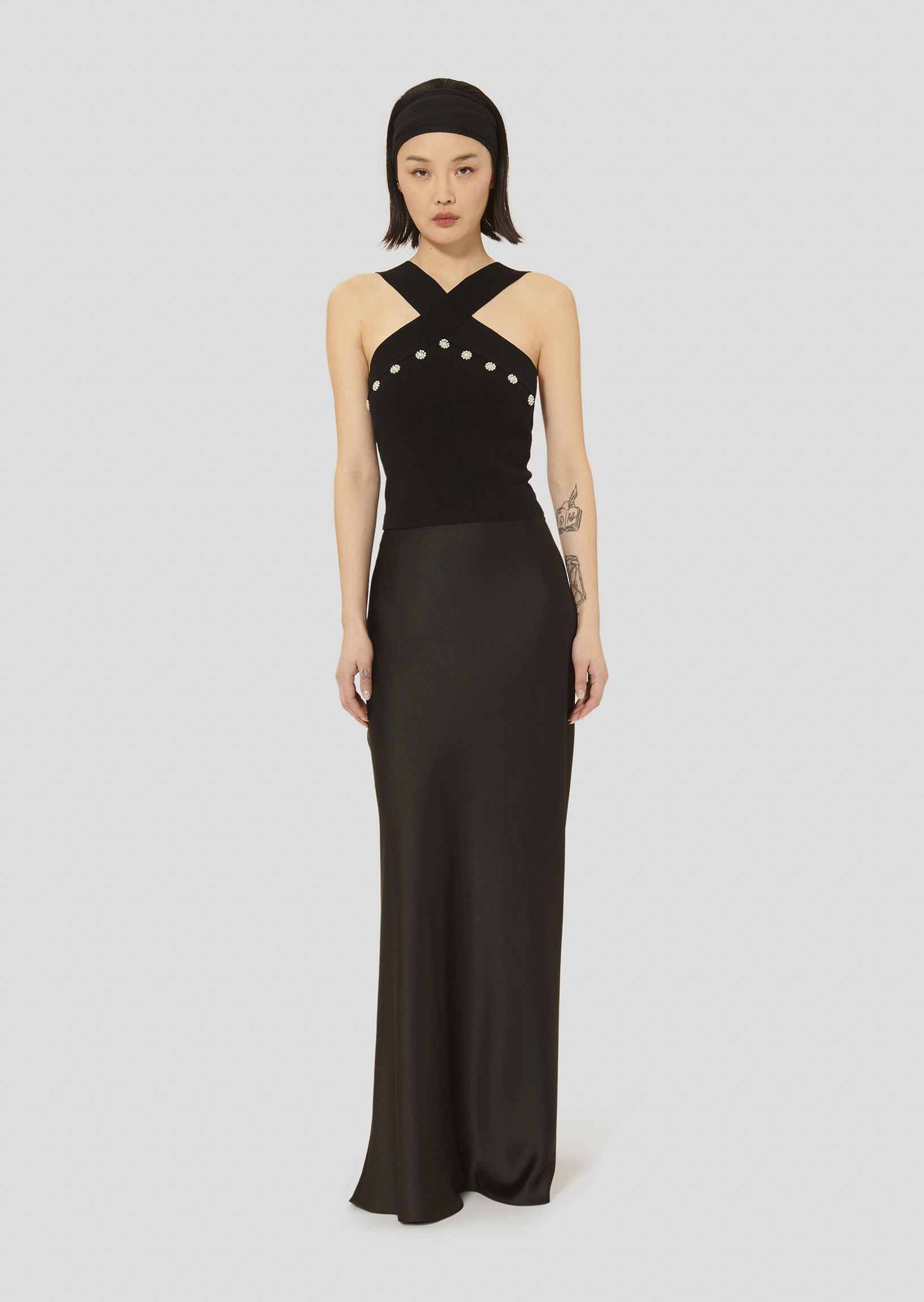 Ce top court noir se croise à l'avant et au dos. Sa maille effet gaufré lui apporte toute son originalité. Son dos est travaillé pour dévoiler le dos de façon élégante. Il est décoré au-devant par de jolies perles nacrées formant de petites fleurs.