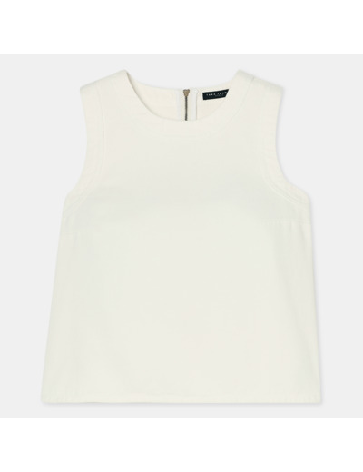 Ce haut en denim blanc sans manches possède une coupe courte légèrement évasée et une encolure ronde. Il se ferme au niveau de la nuque par un zip métallique. On le porte avec le jean Jerome assorti pour un total look denim estival.