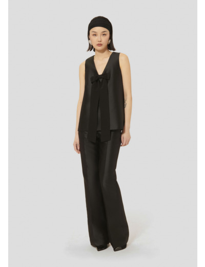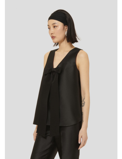 Ce top noir en satin duchesse est sans manches et possède une coupe droite ainsi qu'un col V. Il se ferme par un zip invisible dans le dos. Sa touche Tara réside dans le noeud ton sur ton cousu sous le col décorant l'avant.