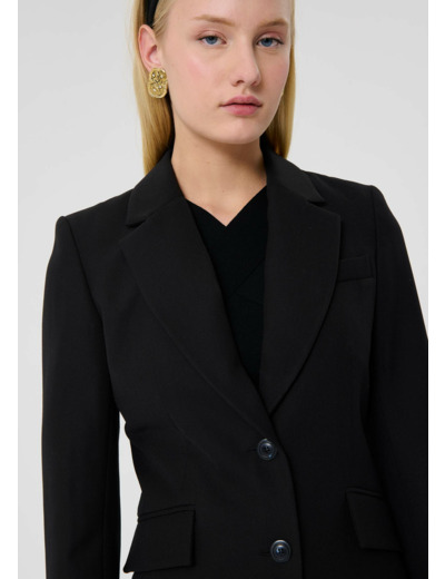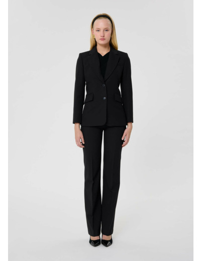 Cette veste tailleur noire en laine possède un col à revers, des boutons aux poignets, des poches à rabats aux côtés et une fausse poche à la poitrine. Elle est cintrée à la taille et sa coupe est structurée par des épaulettes. Elle se ferme par deux boutons ton sur ton à l'avant.