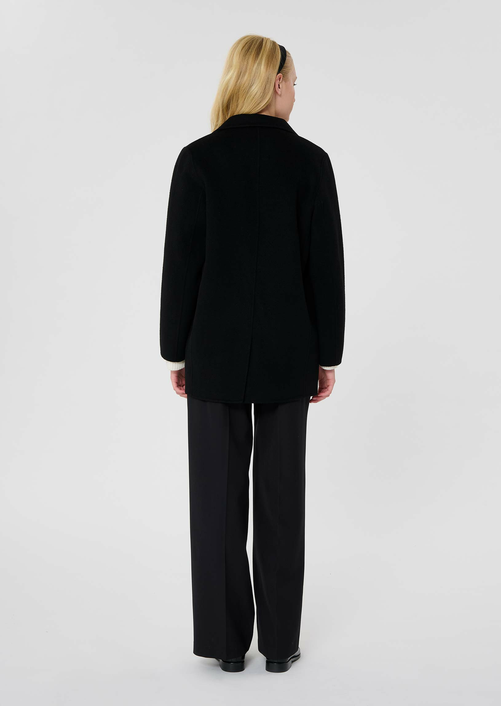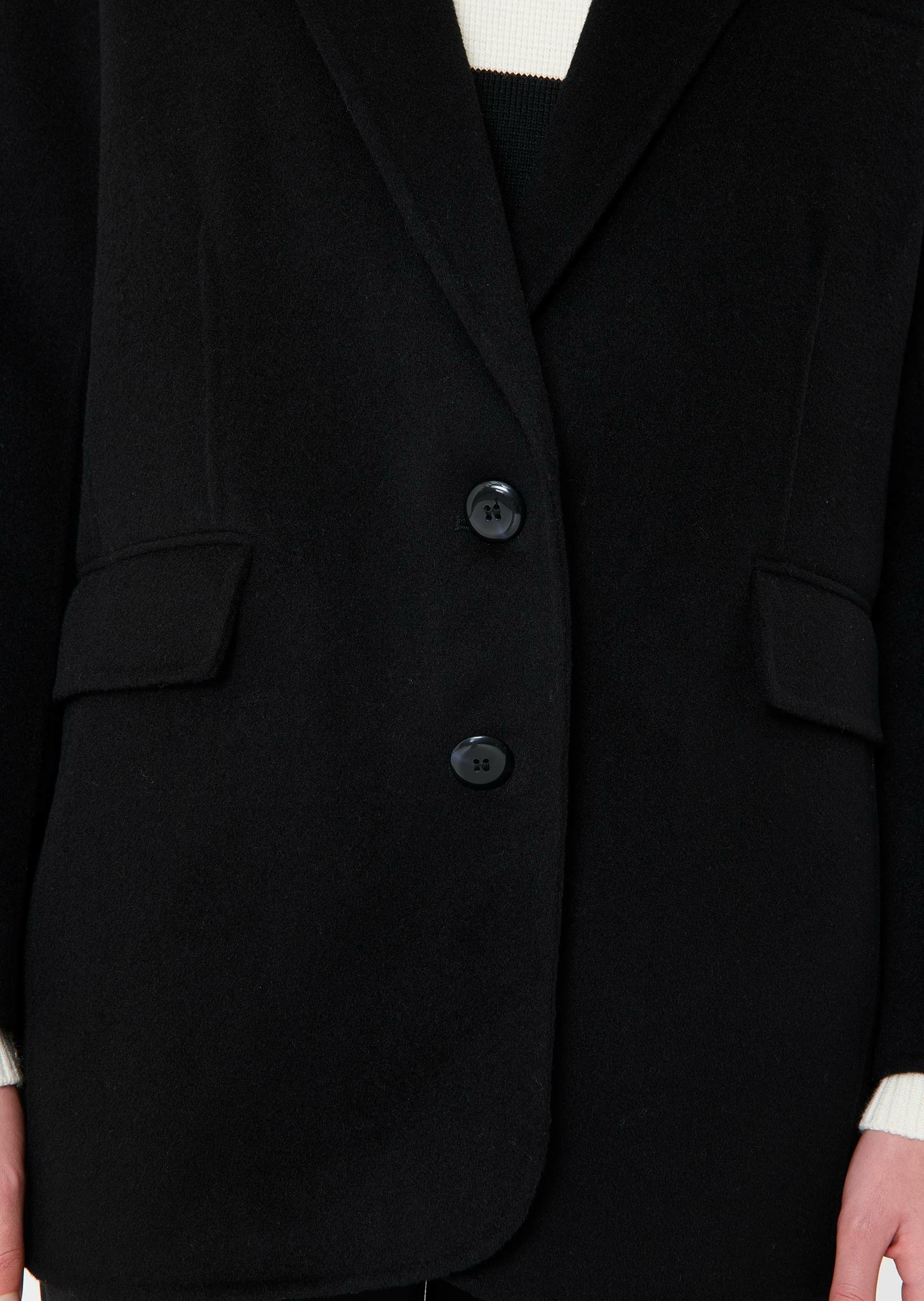 Cette veste noire en laine double face possède une coupe droite et oversized, un col à revers et des manches longues. Elle a deux grandes poches aux côtés et une poche à la poitrine sur laquelle est brodé le monogramme de la maison. Elle se ferme par deux boutons ton sur ton audevant.