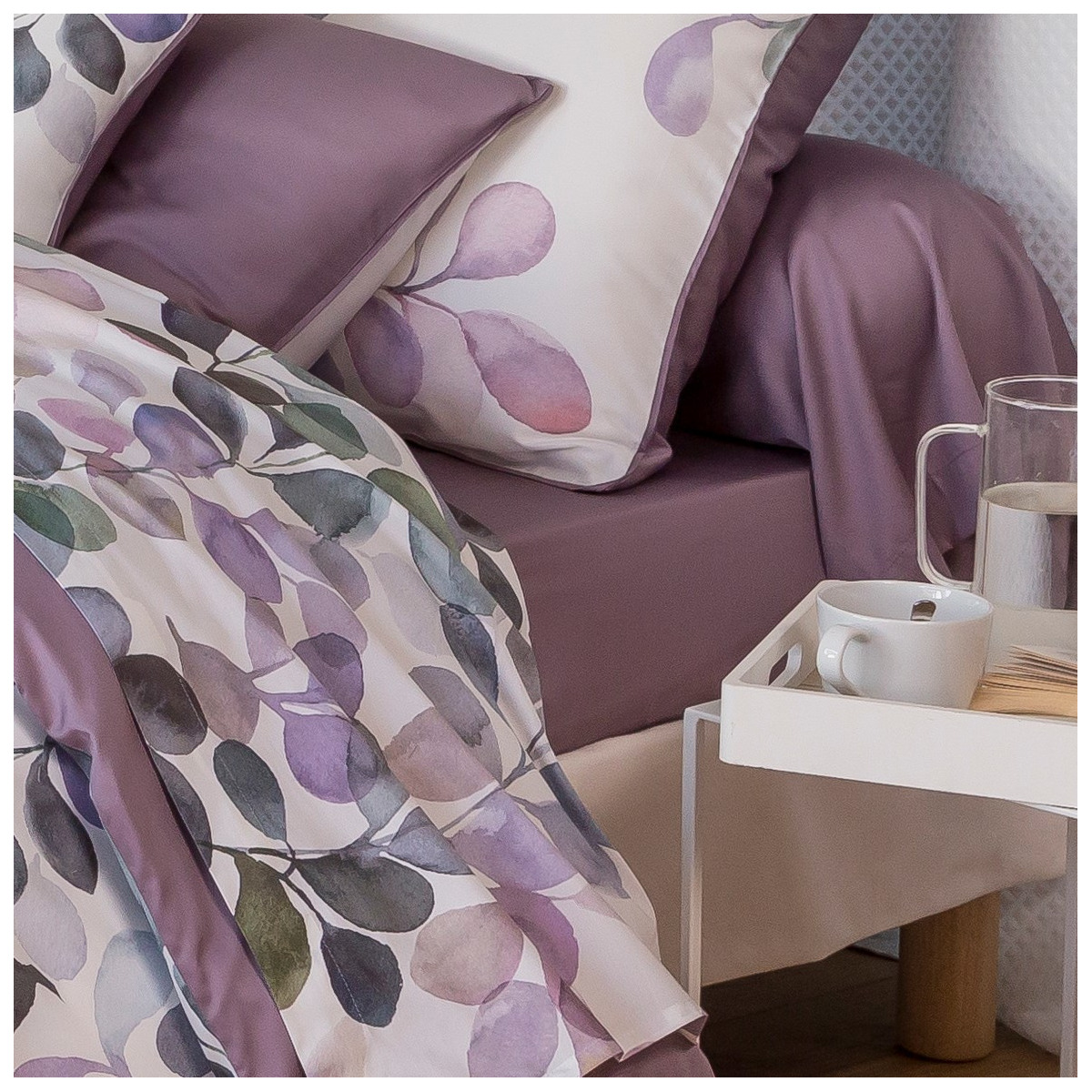 Le drap-housse Eclose est uni parme et existe pour lit simple ou double.