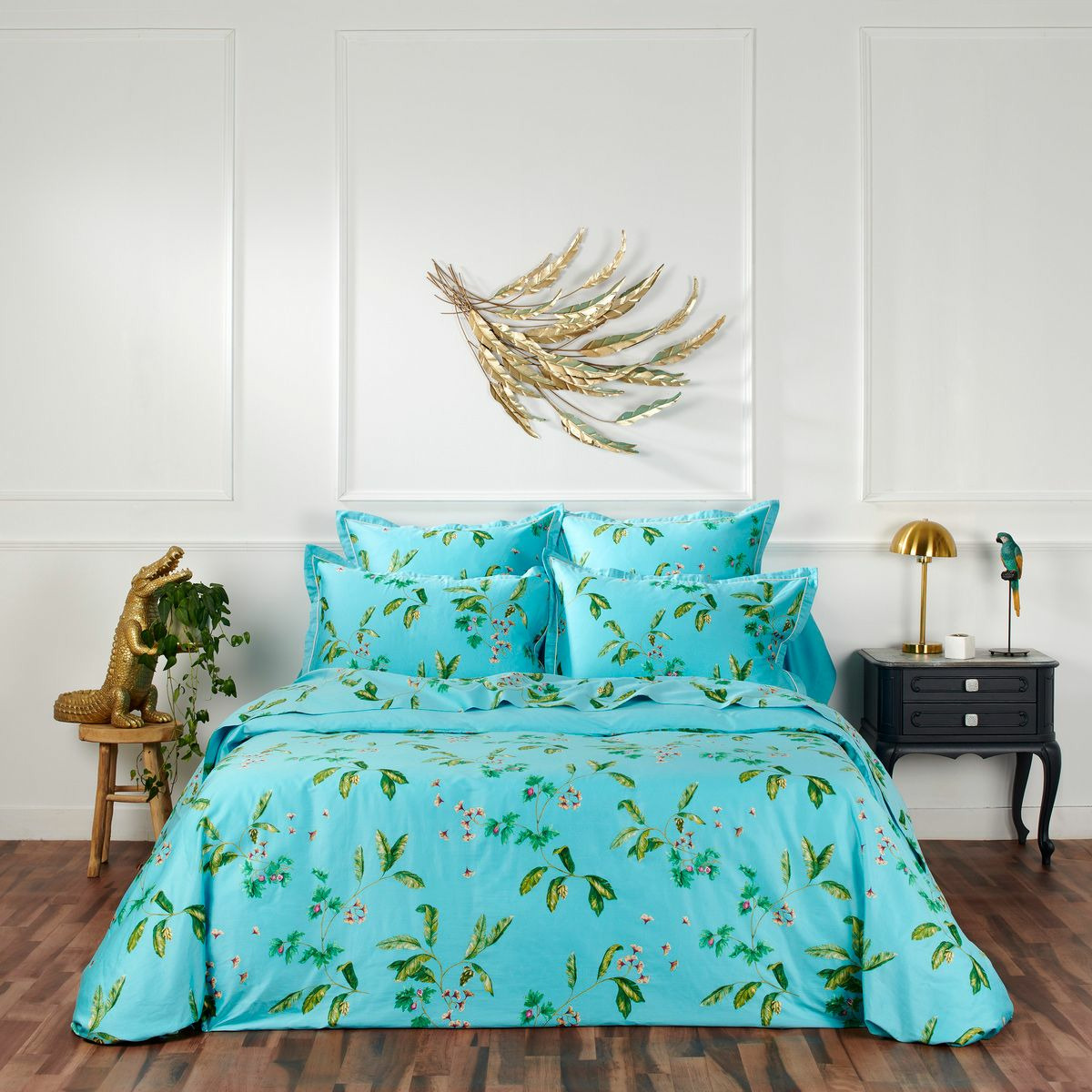L'imprimé végétal délicat contraste avec le fond turquoise pour apporter une touche unique à votre chambre. Les feuilles et baies créent une ambiance sereine, parfaite pour se détendre et se ressourcer.