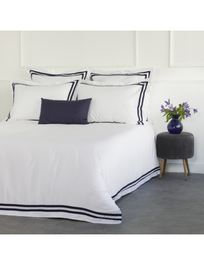 Conçue dans un luxueux satin de coton blanc, cette collection apporte une touche chic à votre chambre à coucher. Son élément distinctif est la bande appliquée en couleur marine qui forme un parement autour de la housse de couette et des taies, ajoutant une dimension visuelle unique et un contraste subtil.