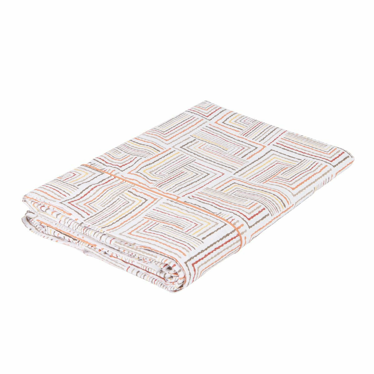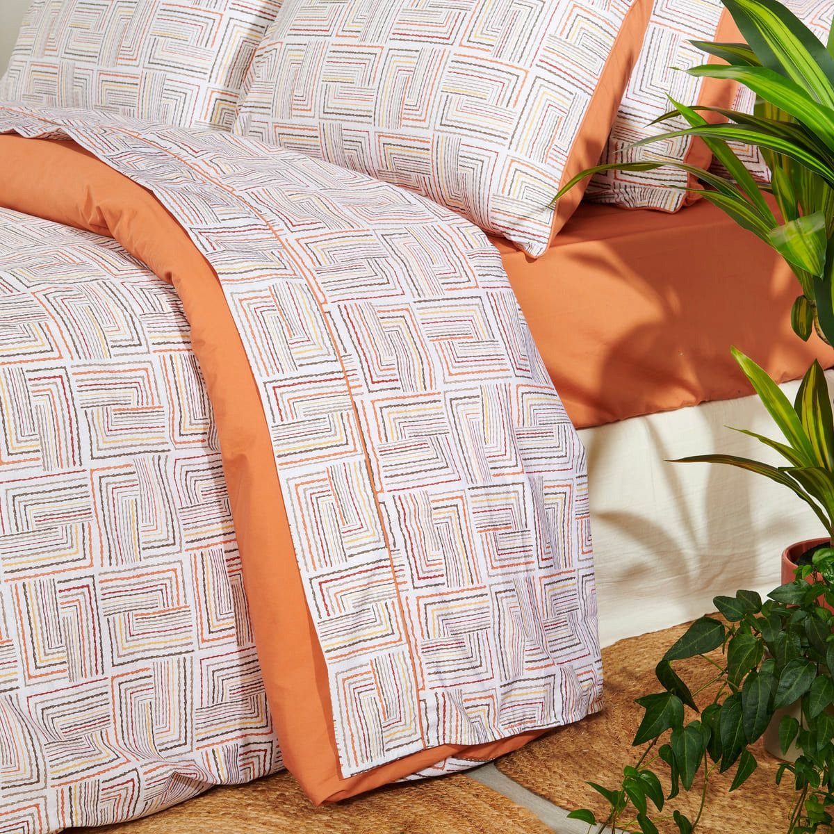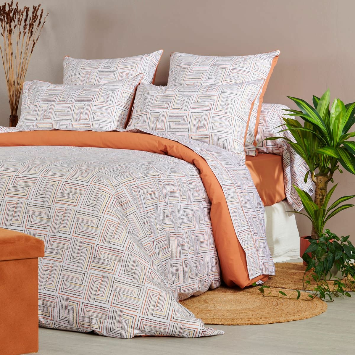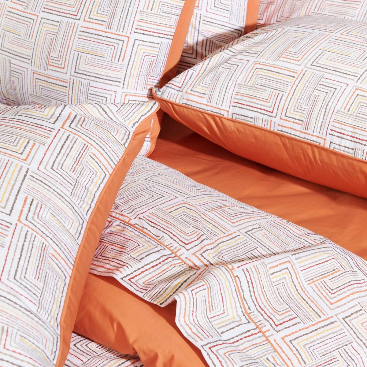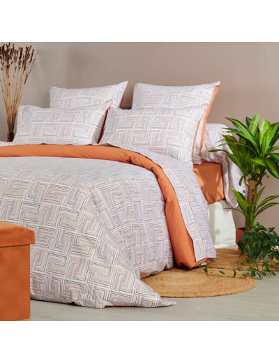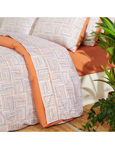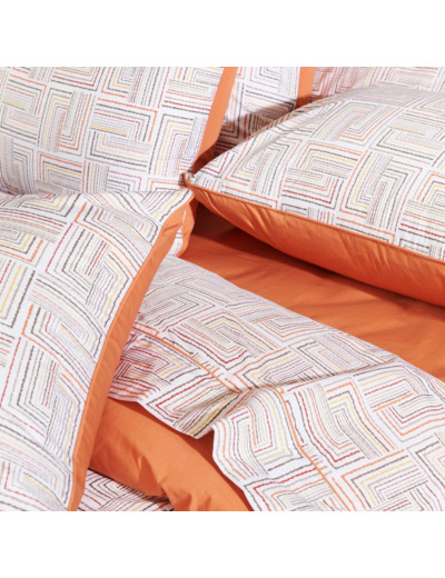 La collection de linge de lit Dédale est confectionnée en percale de coton 120 fils/cm², offrant un toucher doux et soyeux qui allie confort et élégance. Son motif graphique évoque un labyrinthe aux lignes entrelacées dans des tons de orangé, beige et blanc cassé. Idéale pour un intérieur à la fois chic et accueillant, cette collection allie style géométrique et qualité supérieure pour des nuits paisibles.
