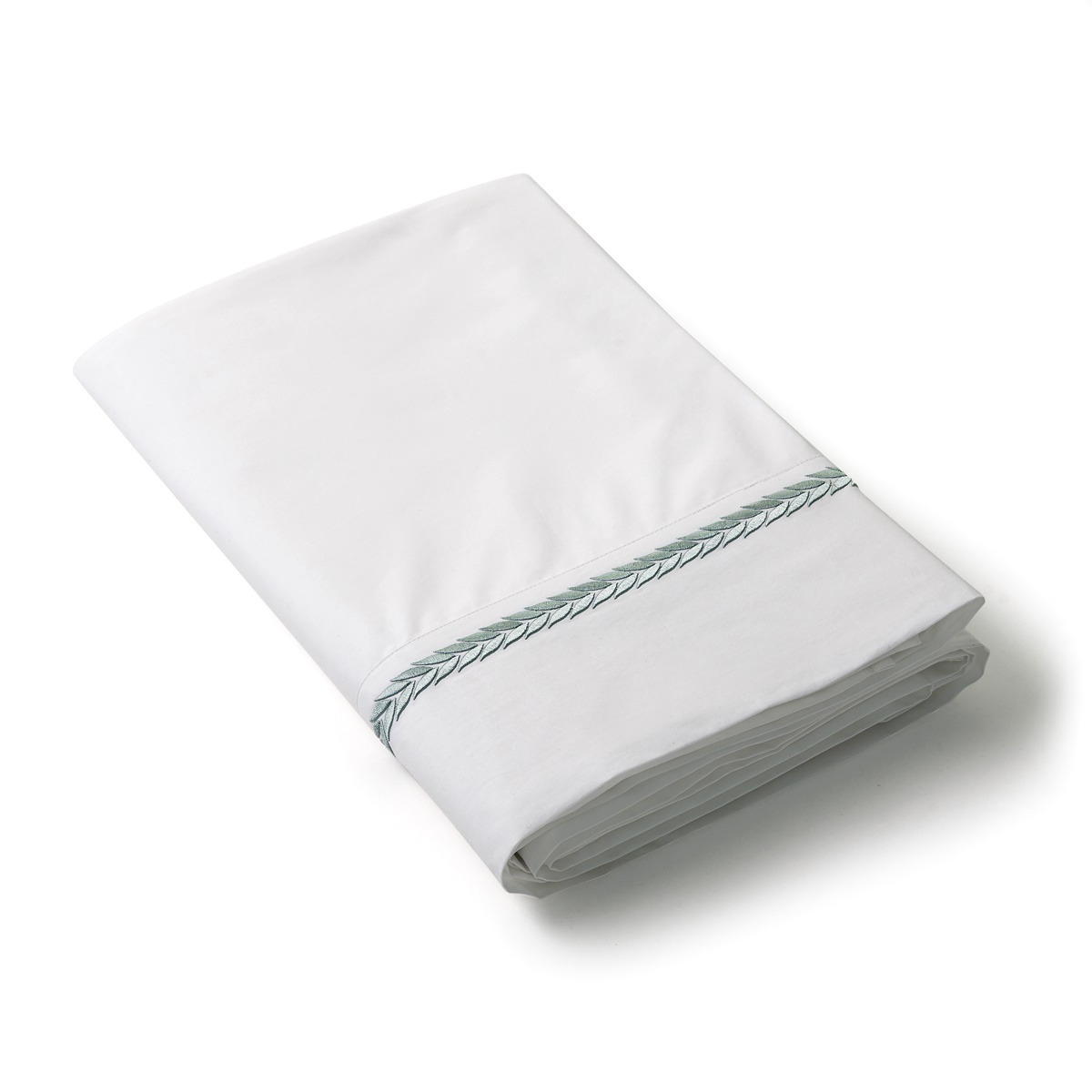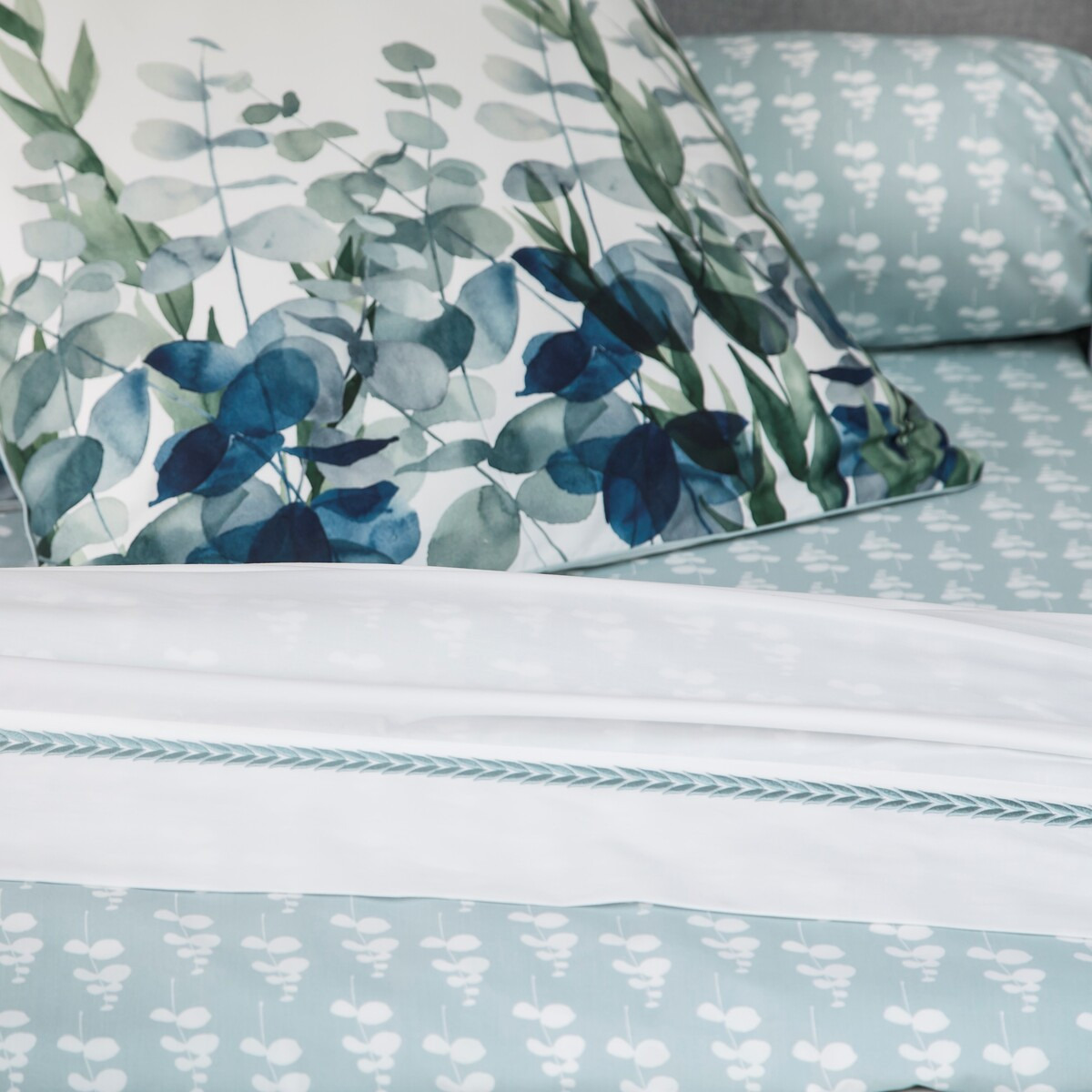 Le drap plat Eucalyptus est assorti à la gamme de linge de lit nature Eucalyptus. Il est de couleur blanches avec un parement finement brodé de petites feuilles vertes.
