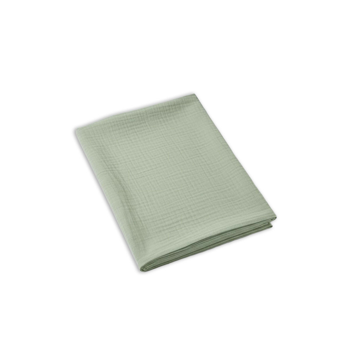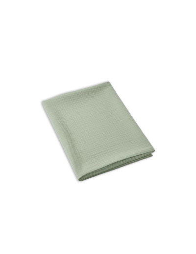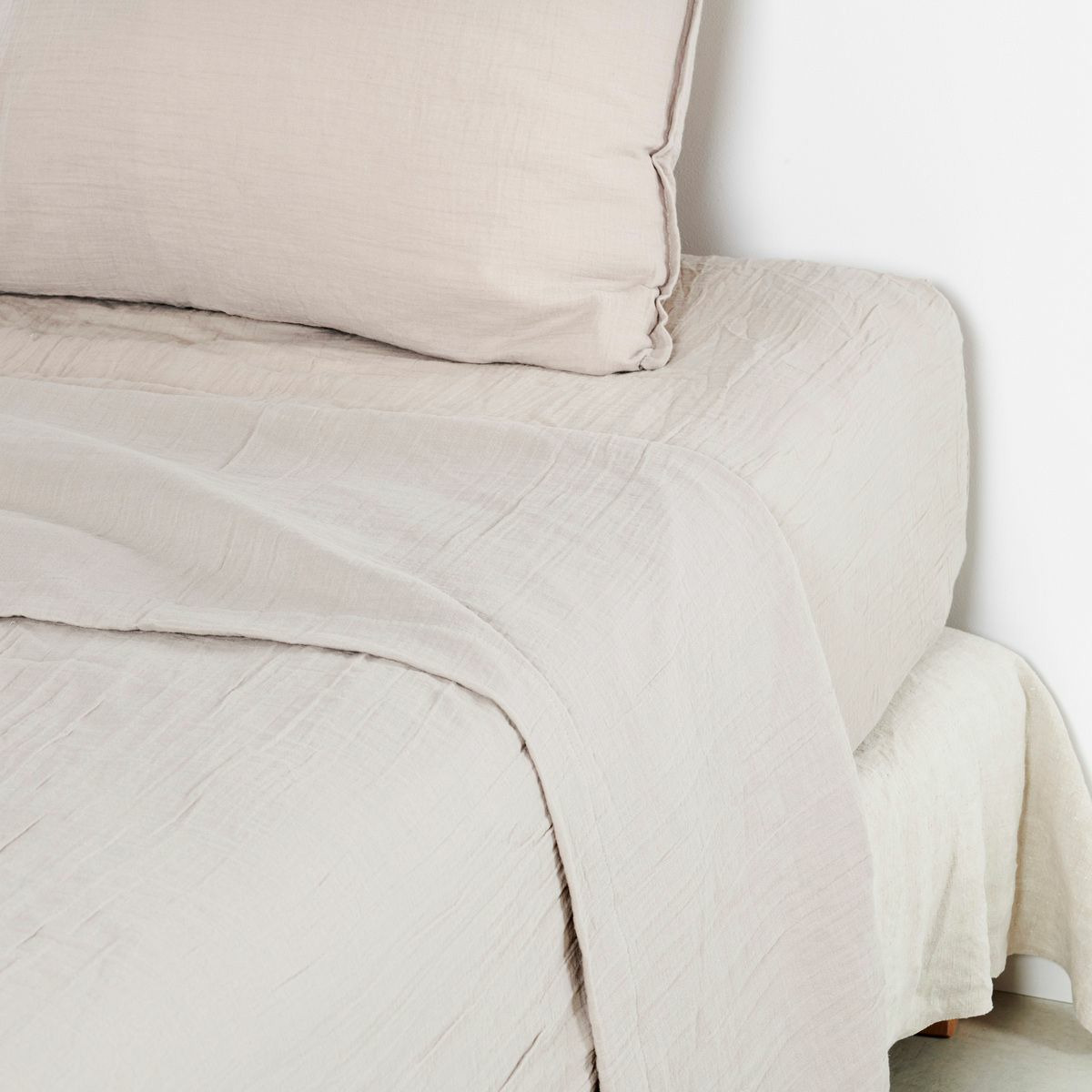 Le drap plat en gaze de coton possède une finition ourlet plat de 5 cm. Il est disponible en blanc et en gris taupe.