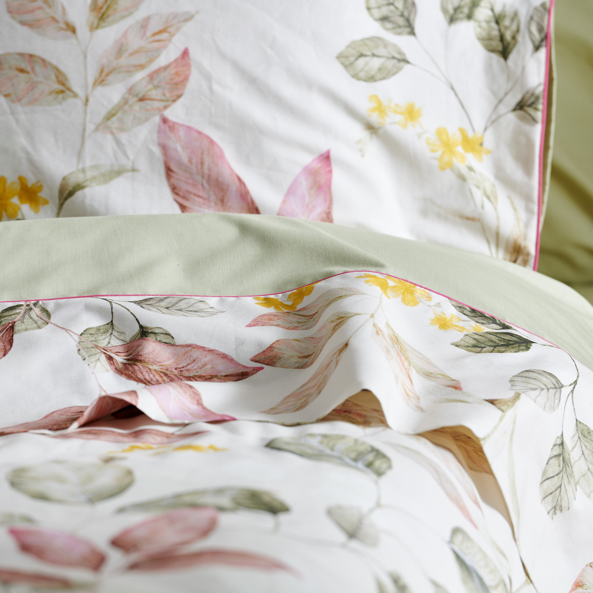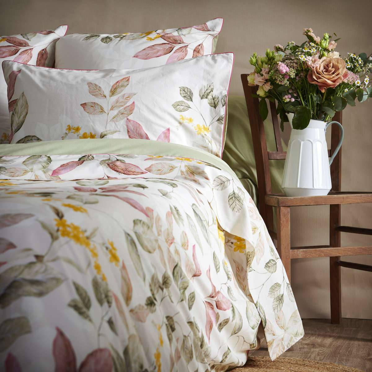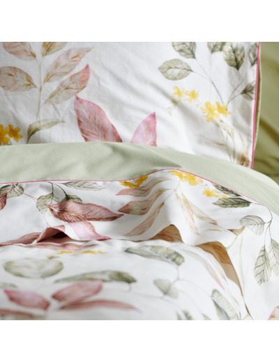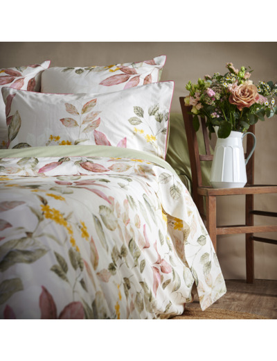 Découvrez la collection Maria, un mélange parfait d'élégance intemporelle et de motifs floraux inspirants. Fabriquée avec soin en percale de coton 80 fils/cm², cette gamme de linge de maison incarne la douceur et le confort. Les tons poudrés et sauges subtils évoquent la tranquillité d'un jardin automnal, tandis que les délicates feuilles d'automne et les fleurs jaunes soleil apportent une touche chaleureuse et vivifiante.