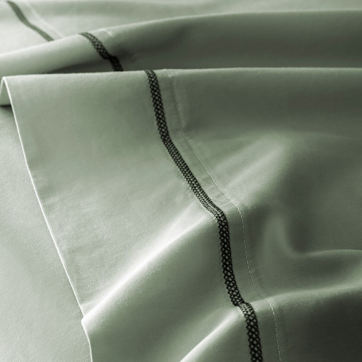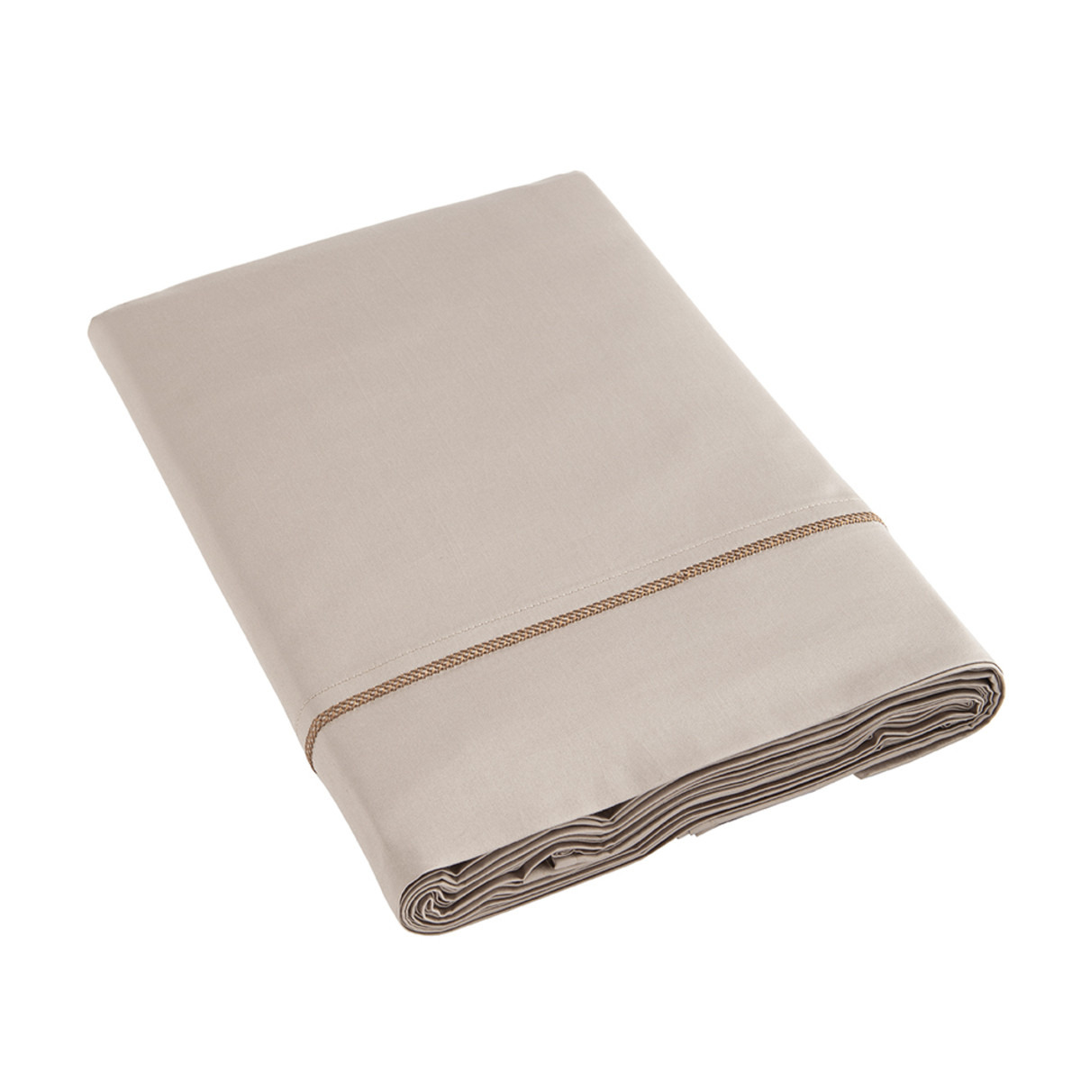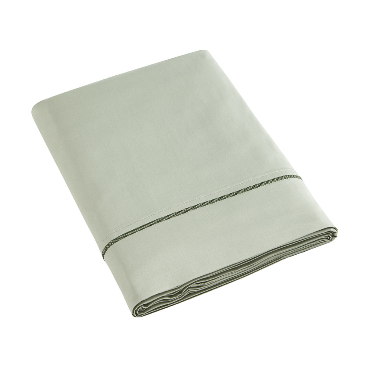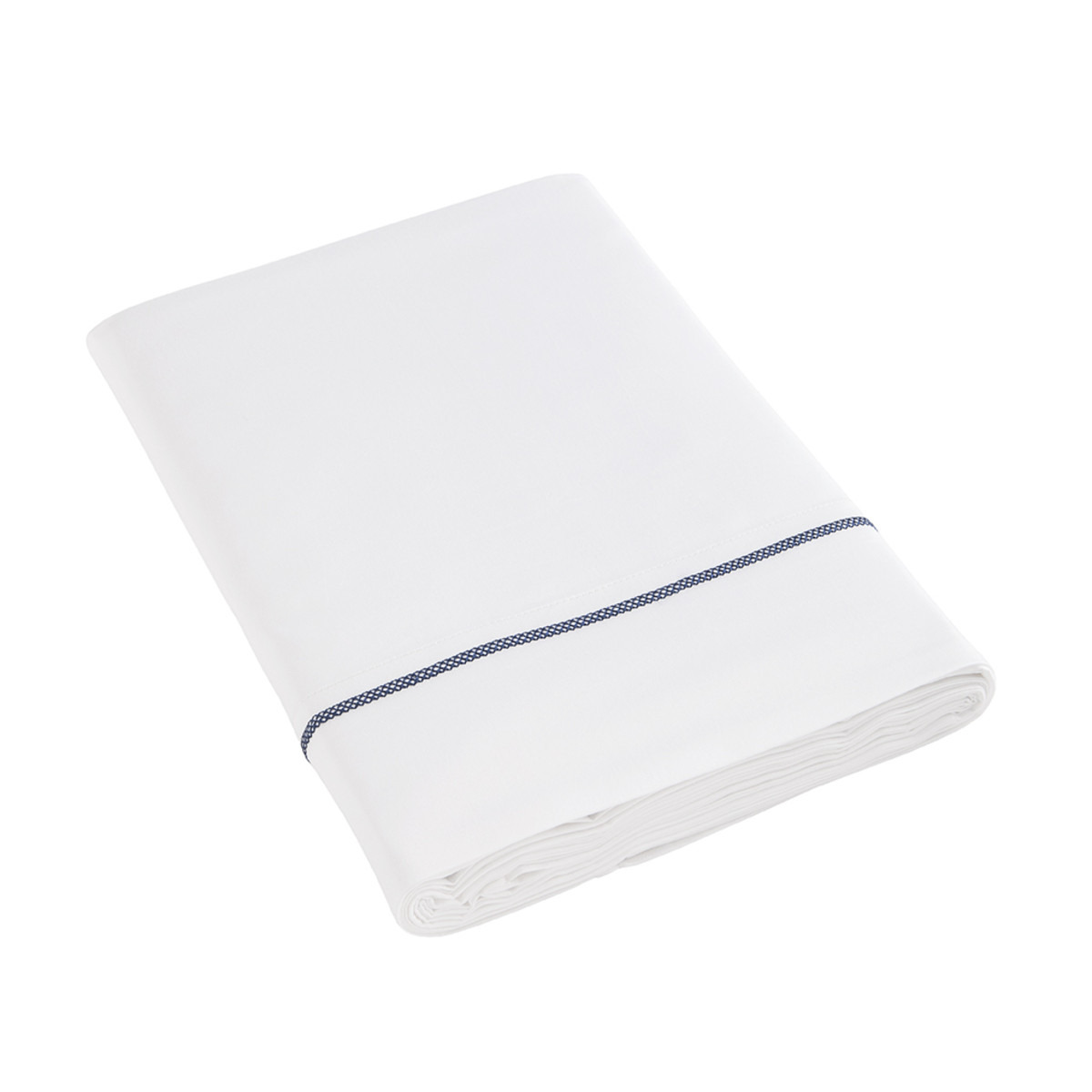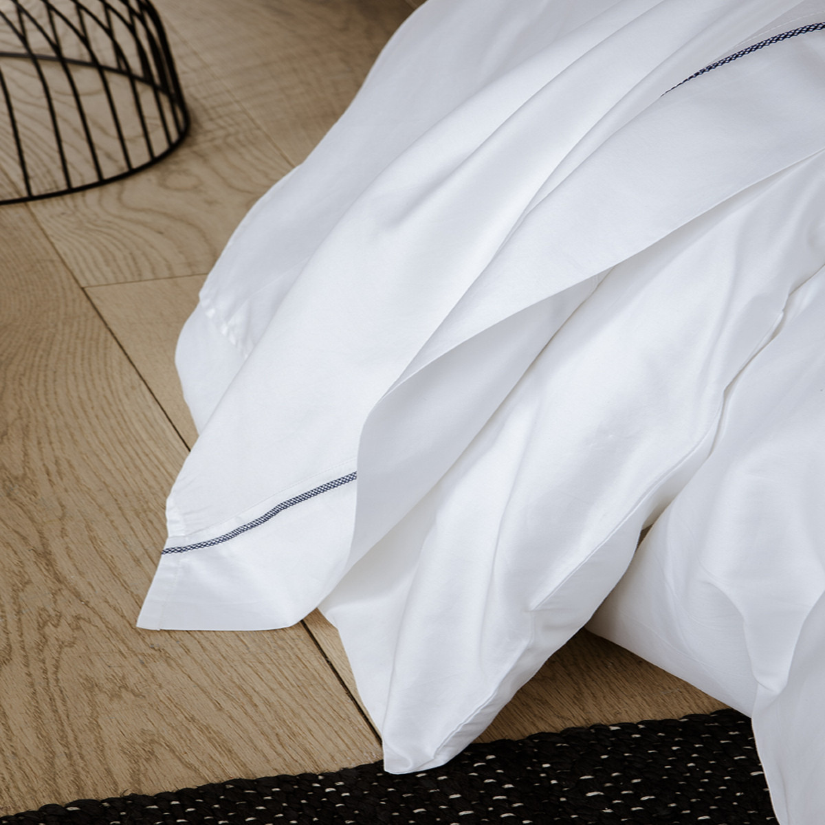 Ce drap plat se décline en 8 coloris : blanc avec bourdon bleu marine, anthracite avec bourdon or, lilas avec bourdon rose pâle, lin avec bourdon marron, or avec bourdon noir, perle avec bourdon anthracite, sauge avec bourdon vert sapin, bleu nuit avec bourdon blanc